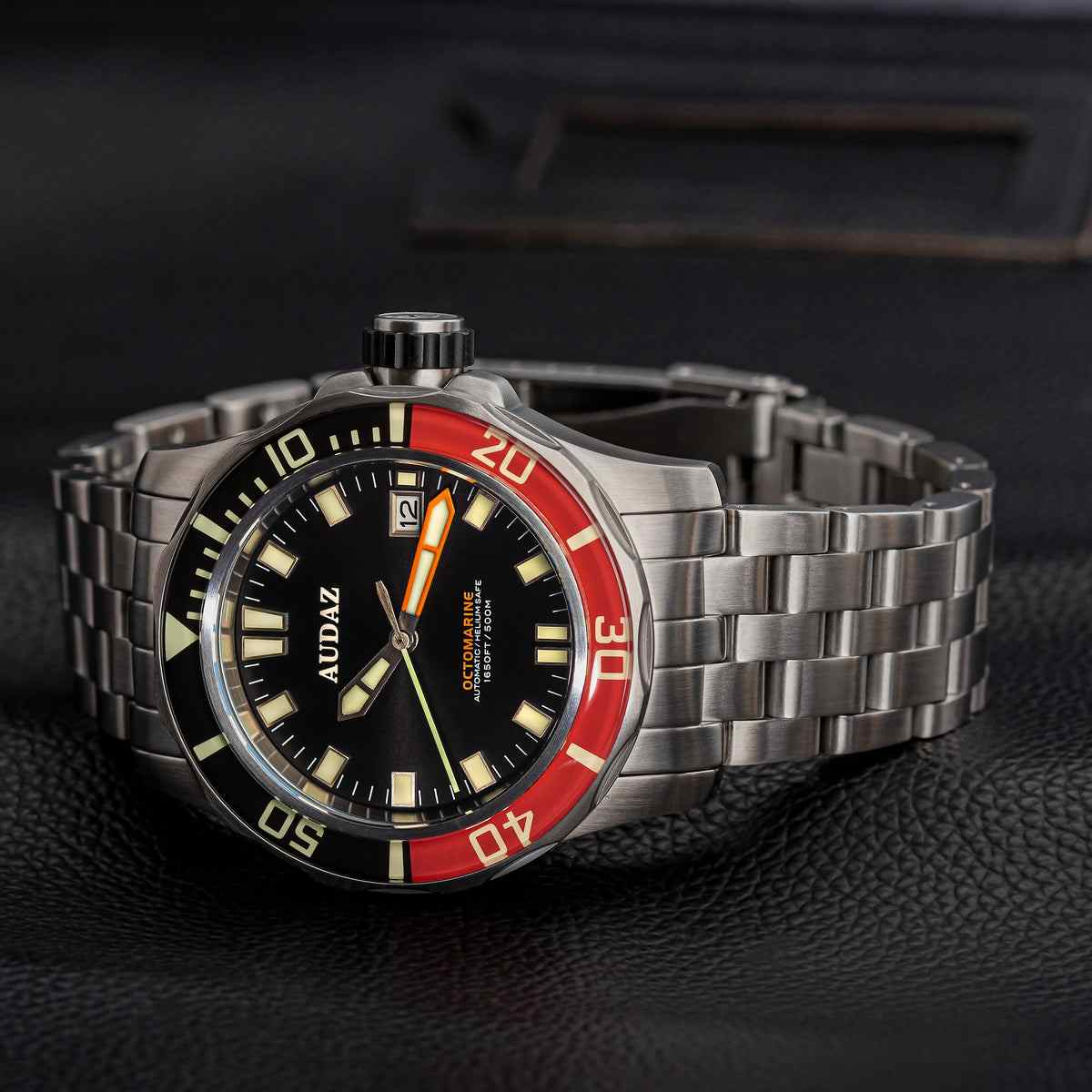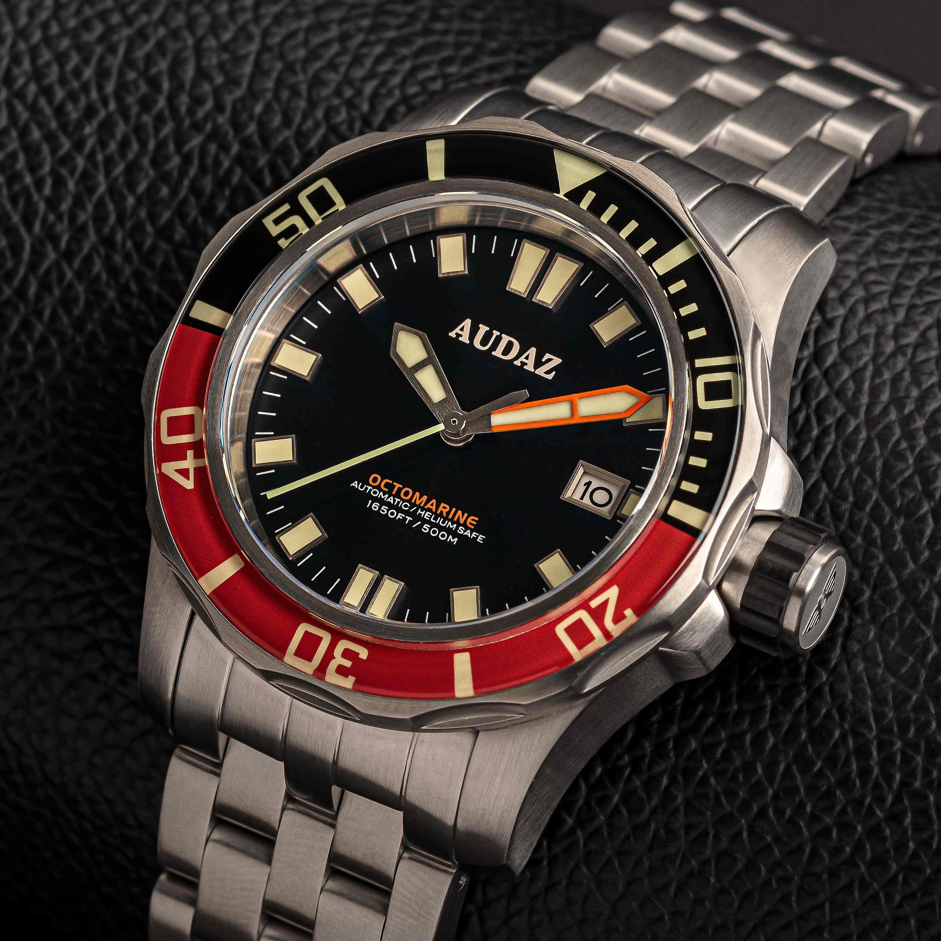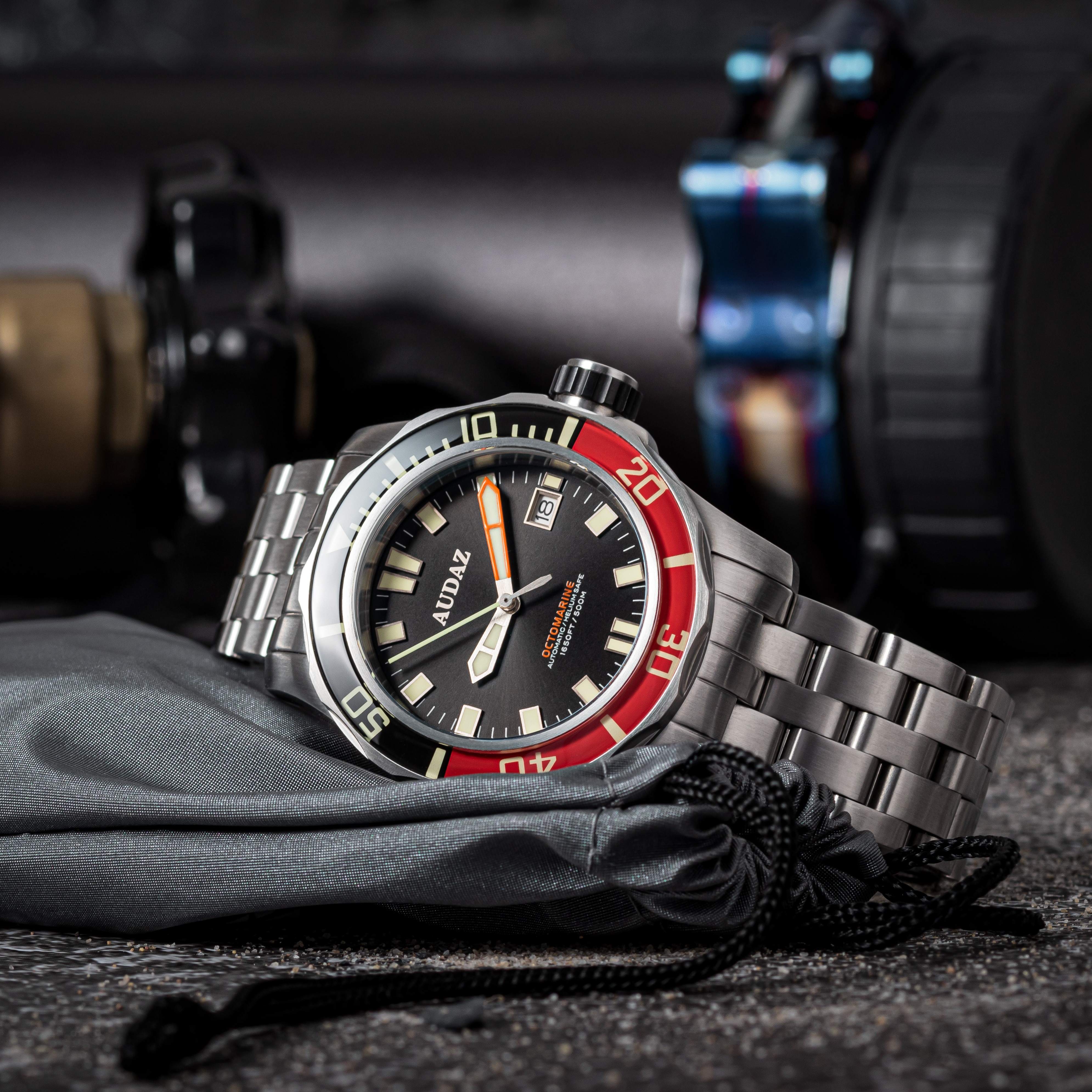 Octomarine 500m Dive Watch is the next level in manifesting our passion for excellence in diver’s watches, maintaining the Audaz DNA with Professional construction, Top-Notch finishing and Bold design aesthetics the Octomarine 500m is designed for the adventurous souls born with the desire to dive deep into the heart of the ocean. Octomarine 500m Case is crafted from a solid block of 316L Stainless Steel, constructed to deliver highest degree of durability and water resistance with practical 42mm wearable size. The watch is complimented with 316L Stainless Steel - 5 Link Bracelet designed for snug fit and robustness with Solid end links. Octomarine 500m dive watch sports Scratch resistant Sapphire Crystal for ultimate longevity. Equipped with Easy gripping notch edge unidirectional bezel design that moves 120’clicks crisply, it is further enhanced by Splendid Ceramic / K1 Hardened Mineral Inserts with filled Lume markers. Legibility in low light condition is paramount for all divers, Octomarine dive watch delivers optimum visibility because of its sword shape hands and applied indexes on the dial that are generously filled with Green Swiss Super Luminova. Octomarine dive watch is engineered for 500m / 1650ft Water Resistance with Screw -down crown, Screw-in Solid Steel and Deep stamped case-back with Octopus motif. The Helium Escape Valve mechanism adds up to the safety of the watch during Saturation diving. The Octomarine 500m is powered by time tested workhorse, 24 jewel - NH35A Seiko Automatic Movement. Octomarine 500m is a must have precision dive watch that delivers performance blends well with your lifestyle.