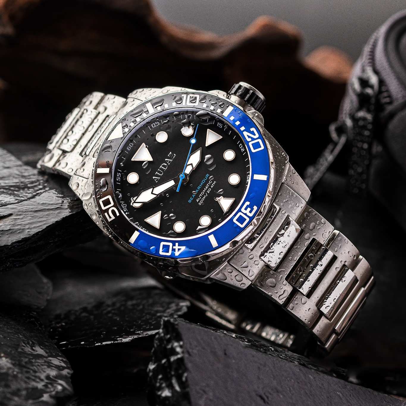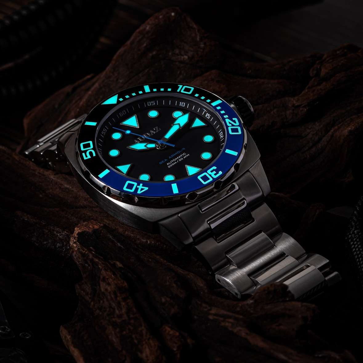 Sea Armour 200m is a game-changer, it delivers our Bold design DNA , Incredible Looks & Professional grade construction for all Dive Watch Lovers. Sea Armour200m Case is crafted from a solid block of 316L Stainless Steel, constructed to deliver highest degree of durability and water resistance with substantial 45mm case width and 15mm total thickness including the Case-back and Crystal. The watch is complimented with 316L Stainless Steel - H Link Bracelet designed for snug fit and robustness with Solid end links. Sea Armour 200m dive watch sports a Scratch resistant Sapphire Crystal for ultimate longevity. Equipped with Unidirectional bezel, and Premium Quality Ceramic insert that is Engraved with 60-minute graduations & filled with Lume that allows the divers to mark the diving time and decompression stops. Legibility of time in any low light condition is paramount for all divers, therefore Sea Armour dive watch delivers optimum visibility with it's decluttered Immaculate dial and its large hands plus applied indexes that are generously filled with Blue glowing Swiss Super Luminova. Sea Armourdive watch is engineered for 200m / 660ft Water Resistance with Screw -down crown, Screw-in Solid and Deep stamped case-back with Anchor motif. The Sea Armour 200m is powered by time tested workhorse, 24 jewel - NH35A Seiko Automatic Movement.