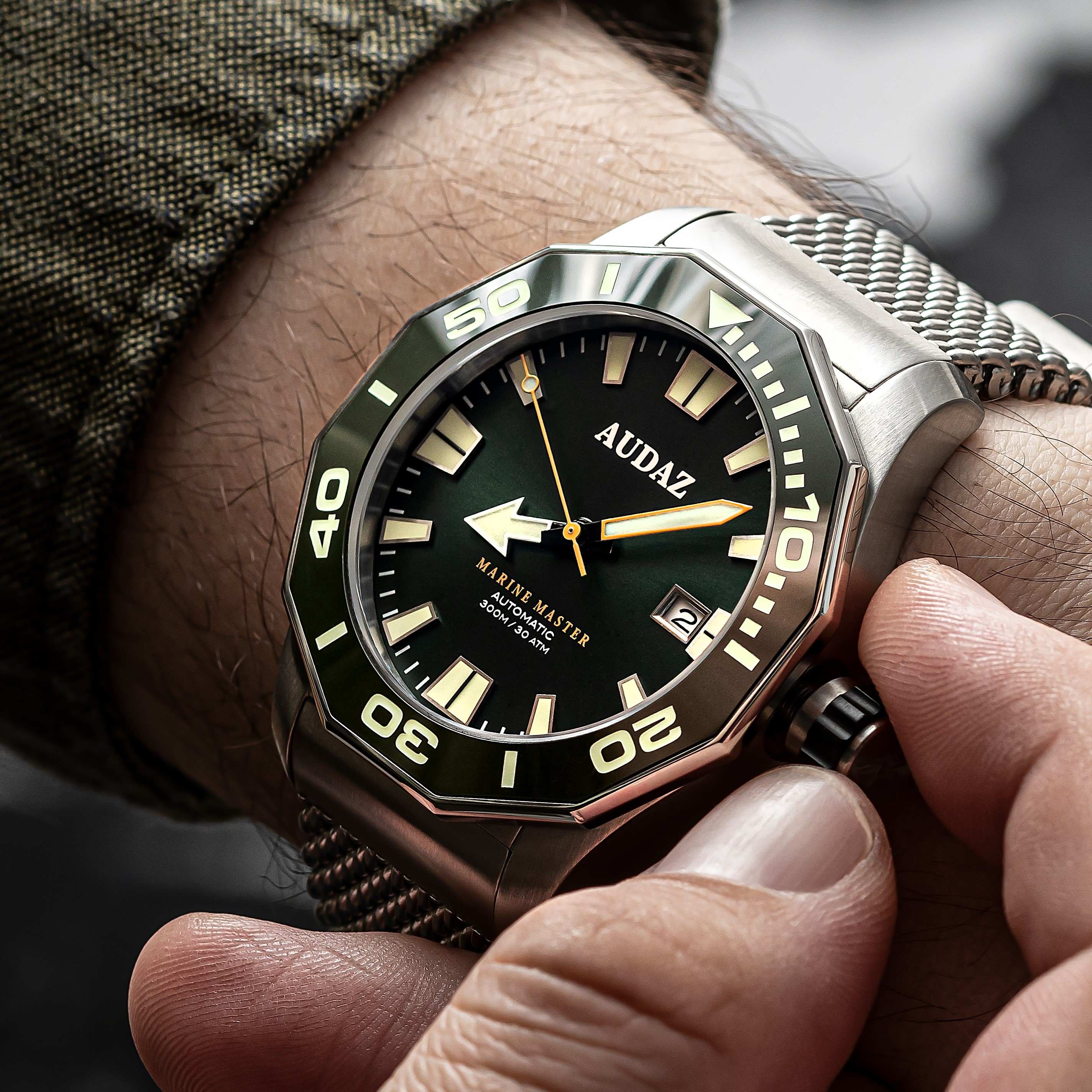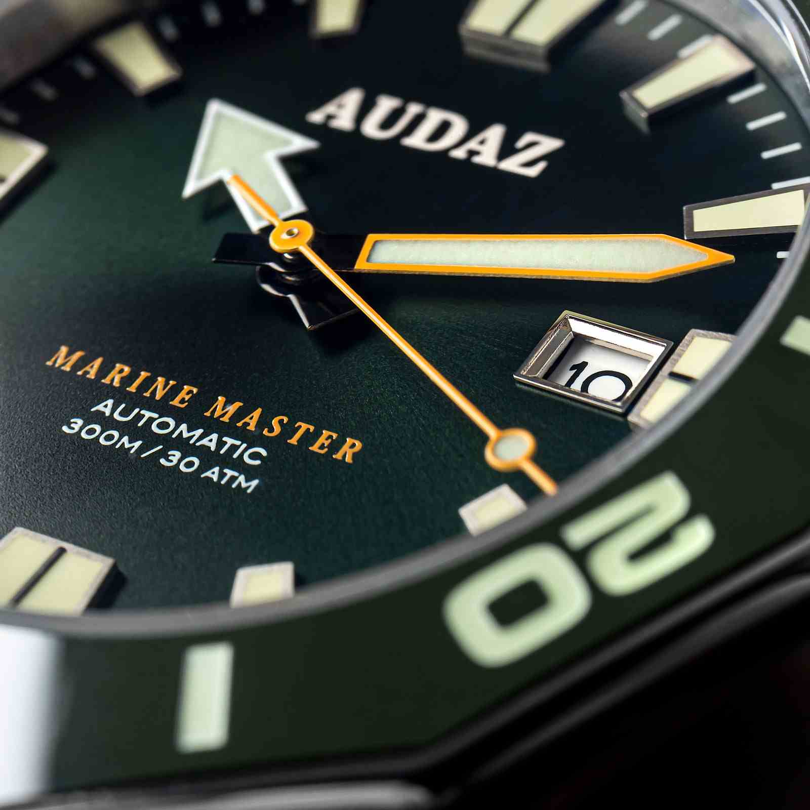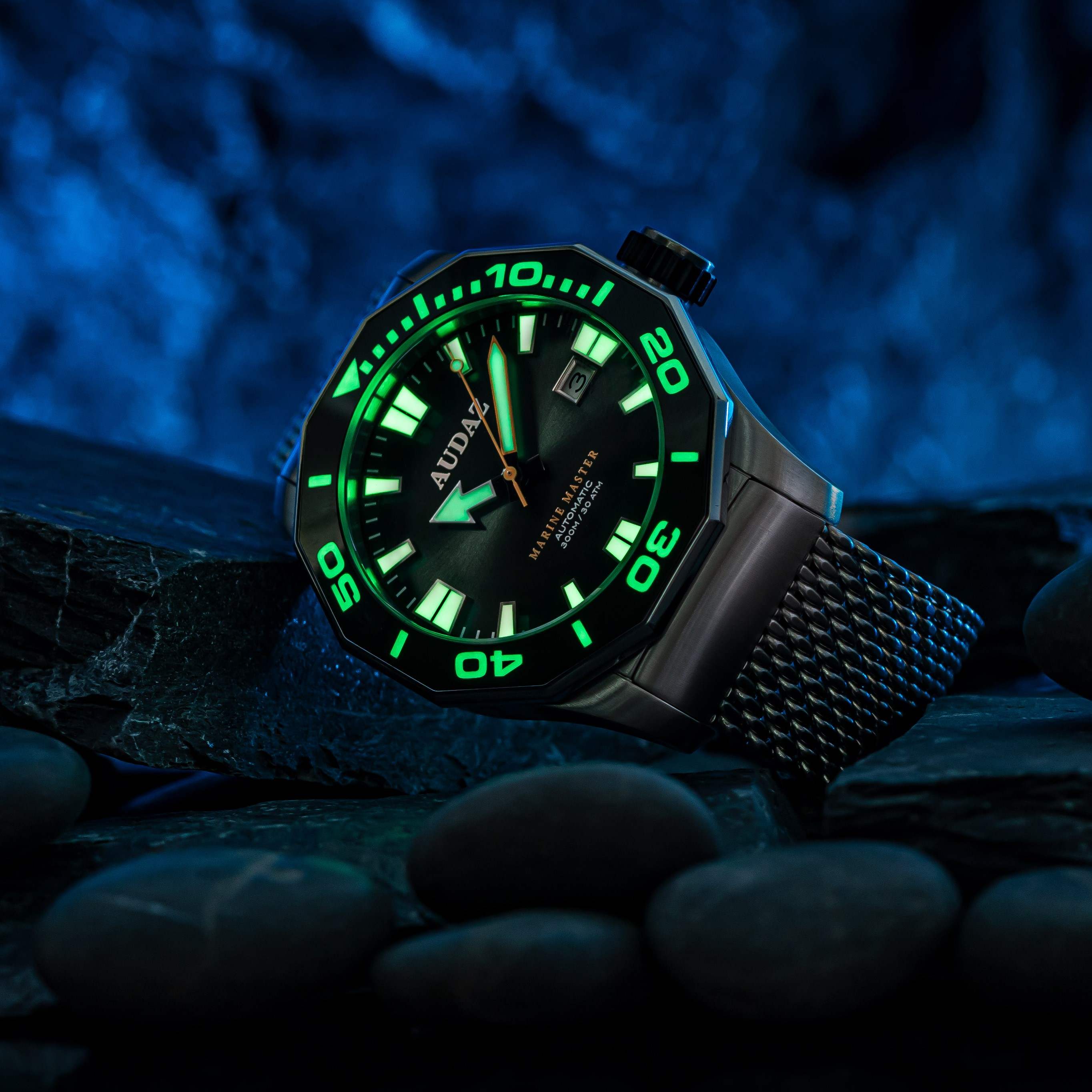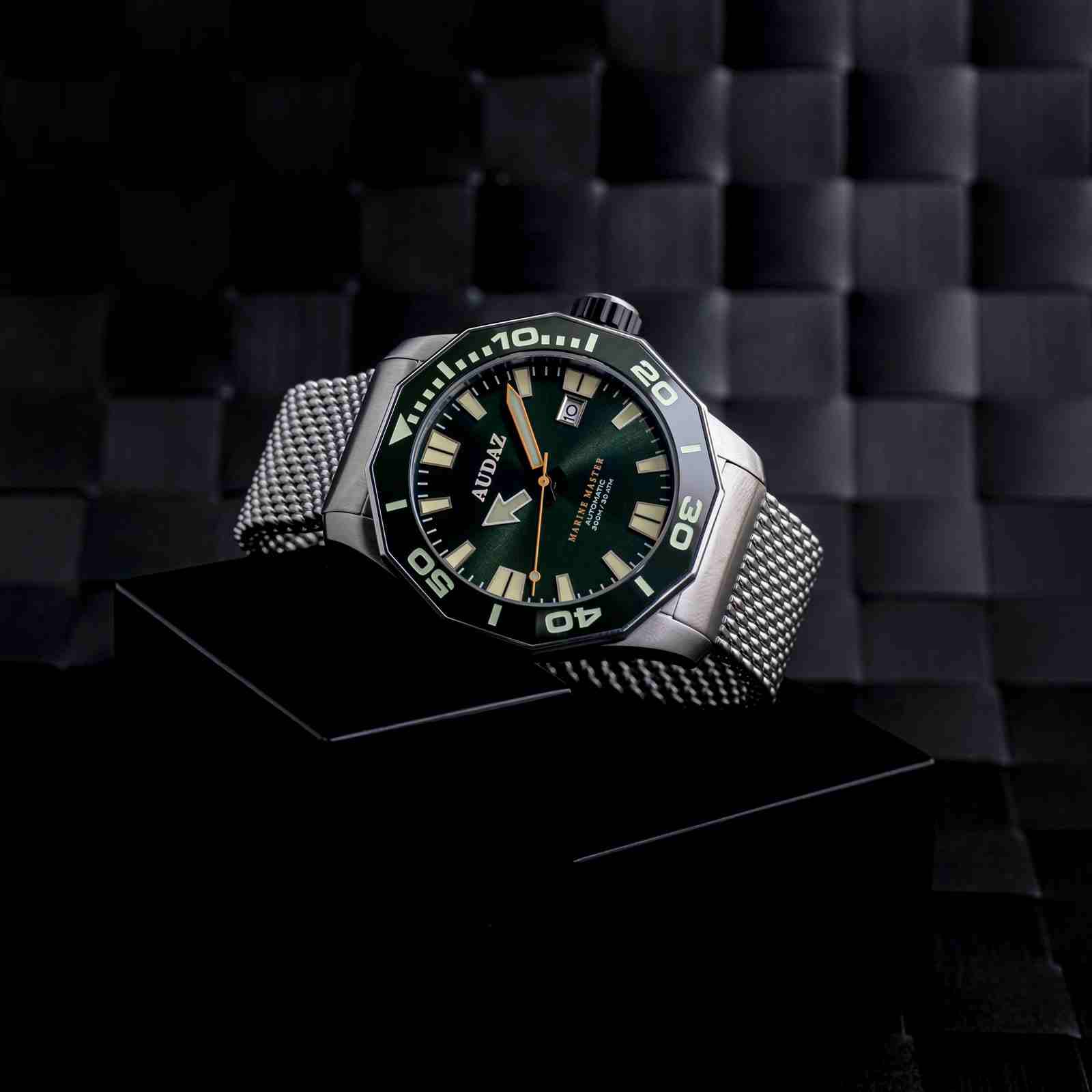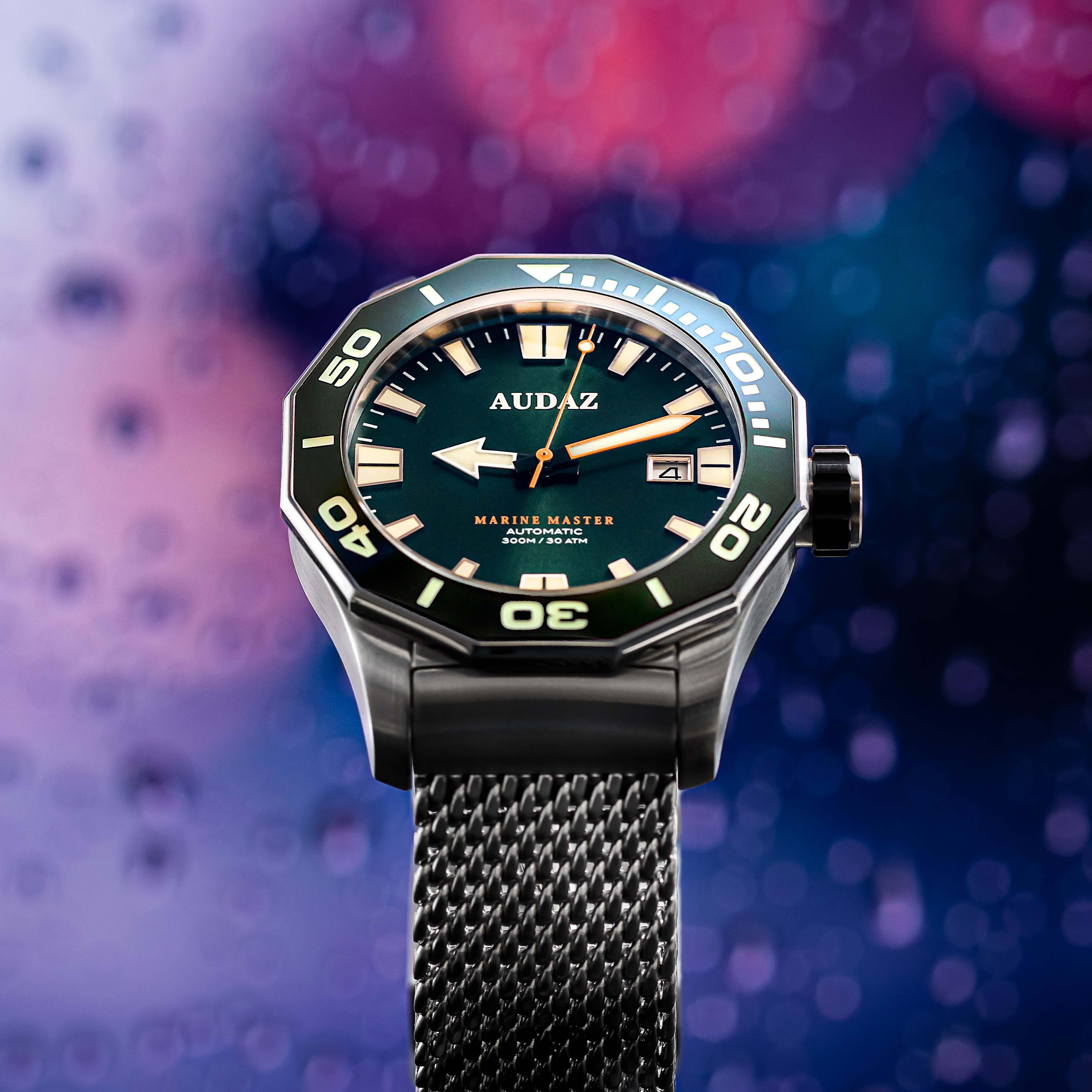 Strikingly different from the rest of our creations, Audaz Marine Master Dive Watch is yet another Bold design with Solid Specs and Vibrant colors that cater especially to the dive watch community around the globe. Marine Master 300m is made from a solid block of 316L Stainless Steel Case with satin brush finish. Featuring scratch resistant Sapphire crystal with Anti reflective coating on the inner side, Screw-in caseback, Screw-down crown and Helium Escape Valve technology for enhanced safety of the watch while saturation diving.Distinctive looks of the watch come from the bespoke designed 12-sided faceted bezel with a soft touch of shiny finish on the edges to compliment the brush finished case. The bezel is inlaid with Premium quality ceramic insert, engraved with 60-minute markers and filled with Swiss SuperLuminova for diver’s time checking. Rugged case is matched equally with a Heavy-duty stainless-steel mesh band that can be easily adjusted on the wrists. For more versatile looks over the weekends, you can swap the steel band with a handy Silicon strap included with the watch. Easy to read Immaculate dials with Large Indices, Hands and Outstanding Lume have been a key feature of all our dive watches. Marine Master being no exception to this, the hands and indices are filled with Swiss SuperLuminova to put on a show when the lights are low, this is imperative for all divers to keep a track of their time under the water. Available in 6 alluring colorways, Audaz Marine Master maintains complete functionality with style. Every timepiece from Audaz will have a Special Caseback, and Marine Master delivers Surreally crafted Caseback with Embossed Humpback Whale splashing out of the blue ocean looking nothing less than spectacular. Marine Master dive watch is built for water resistance up-till 300m of atmospheric pressure, powered by Reliable 24 jewel - NH35A Automatic Movement.
