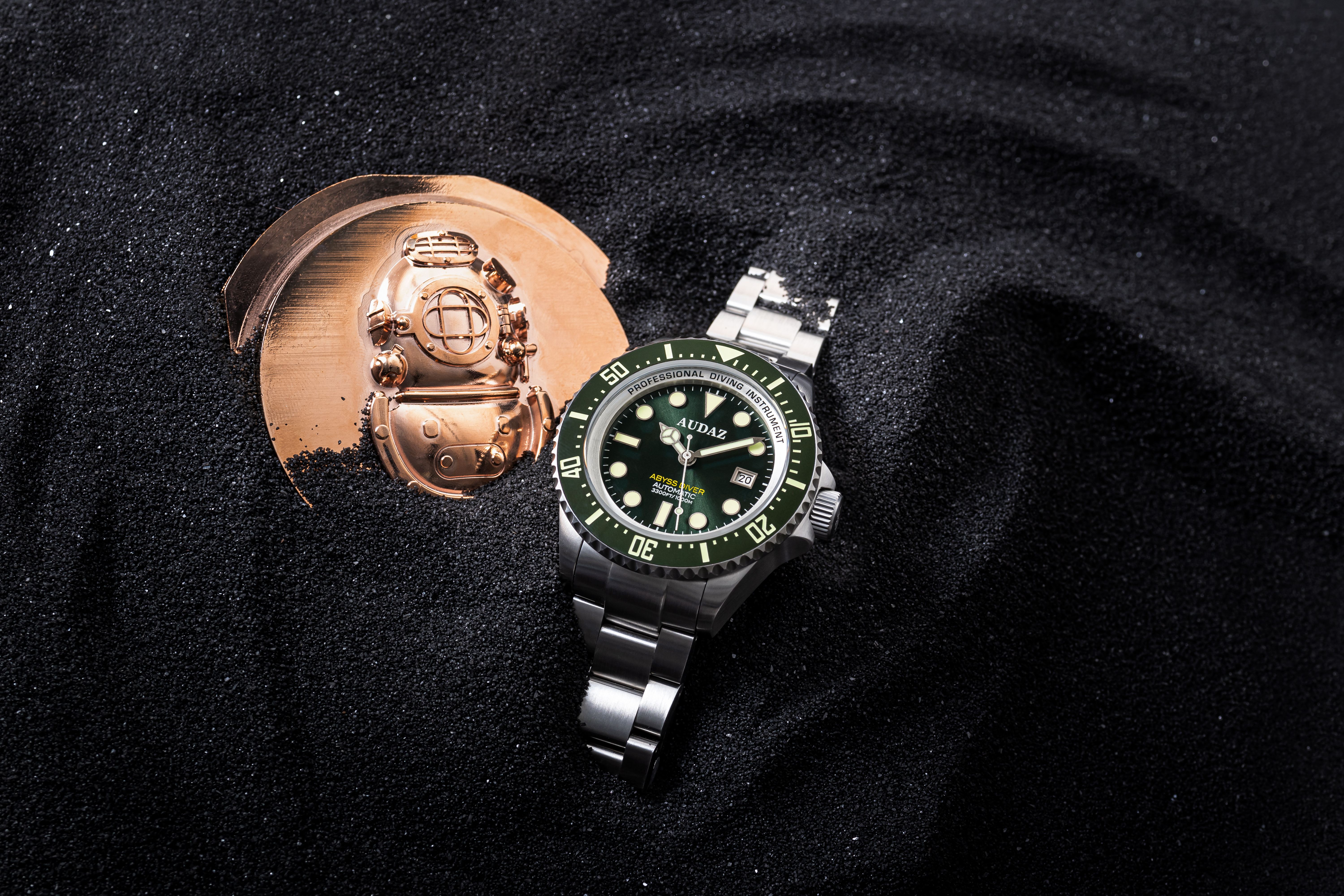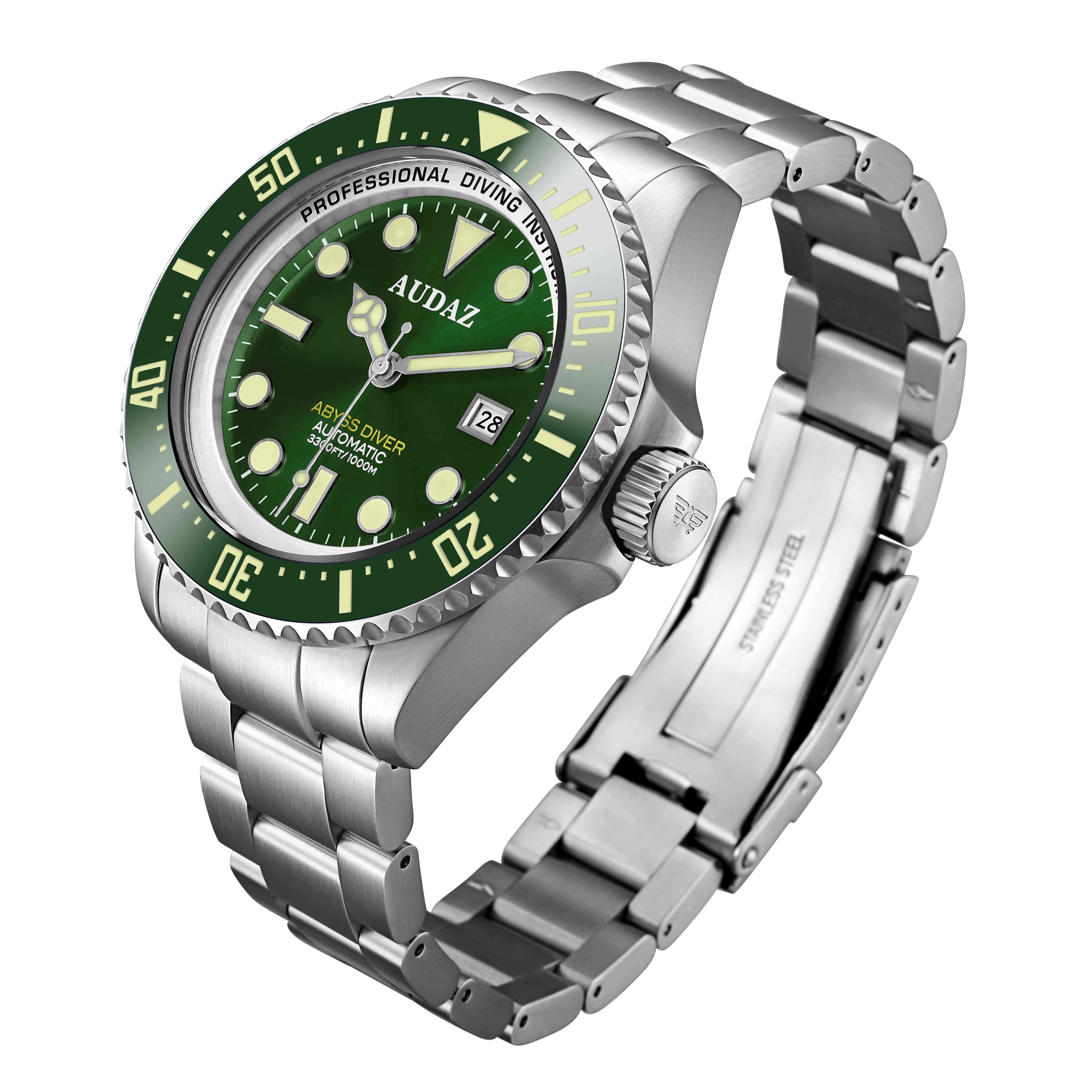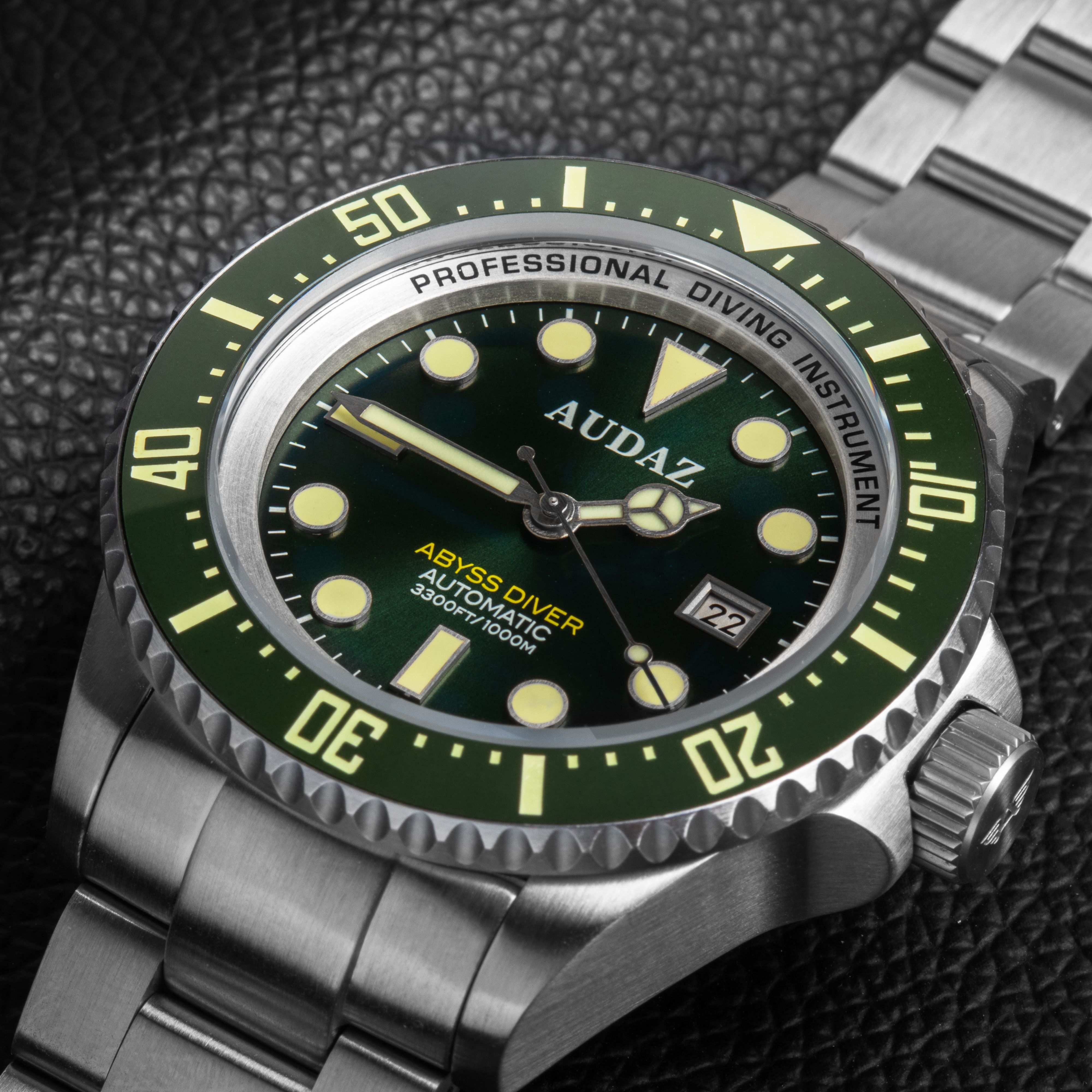 Audaz Watches aspires to breakthrough its own milestones, and is proud to develop an ultra-deep diving timepiece with extreme depth ratings of 100 bar / 1000m water resistance. The Abyss Diver 1000m showcases the brands capabilities and passion for setting new benchmarks. Meticulously detailed and Gloriously built with Exceptional finishing, The Abyss Diver 1000m is the ultimate diving instrument for the professional divers facing unknown challenges exploring the deep seas and is a magnificent timepiece to own for the dive watch aficionados and collectors. Abyss Diver 1000m is built to be indestructible; the watch features a Substantial 44mm size all brush finish case constructed from 316L Stainless Steel material. Turn the watch around and find a solid steel screw-in caseback deeply embossed with Divers Helmet motif adding to the incredible grandeur of this diving masterpiece. Extraordinary Miyota 9015,with a proven legacy powers the Abyss Diver. Undoubtedly this Top Drawer Automatic Movement with 24 Jewels, running at 28800 bph and about 42 hours power reserve is one of the finest Japanese Automatic Movements