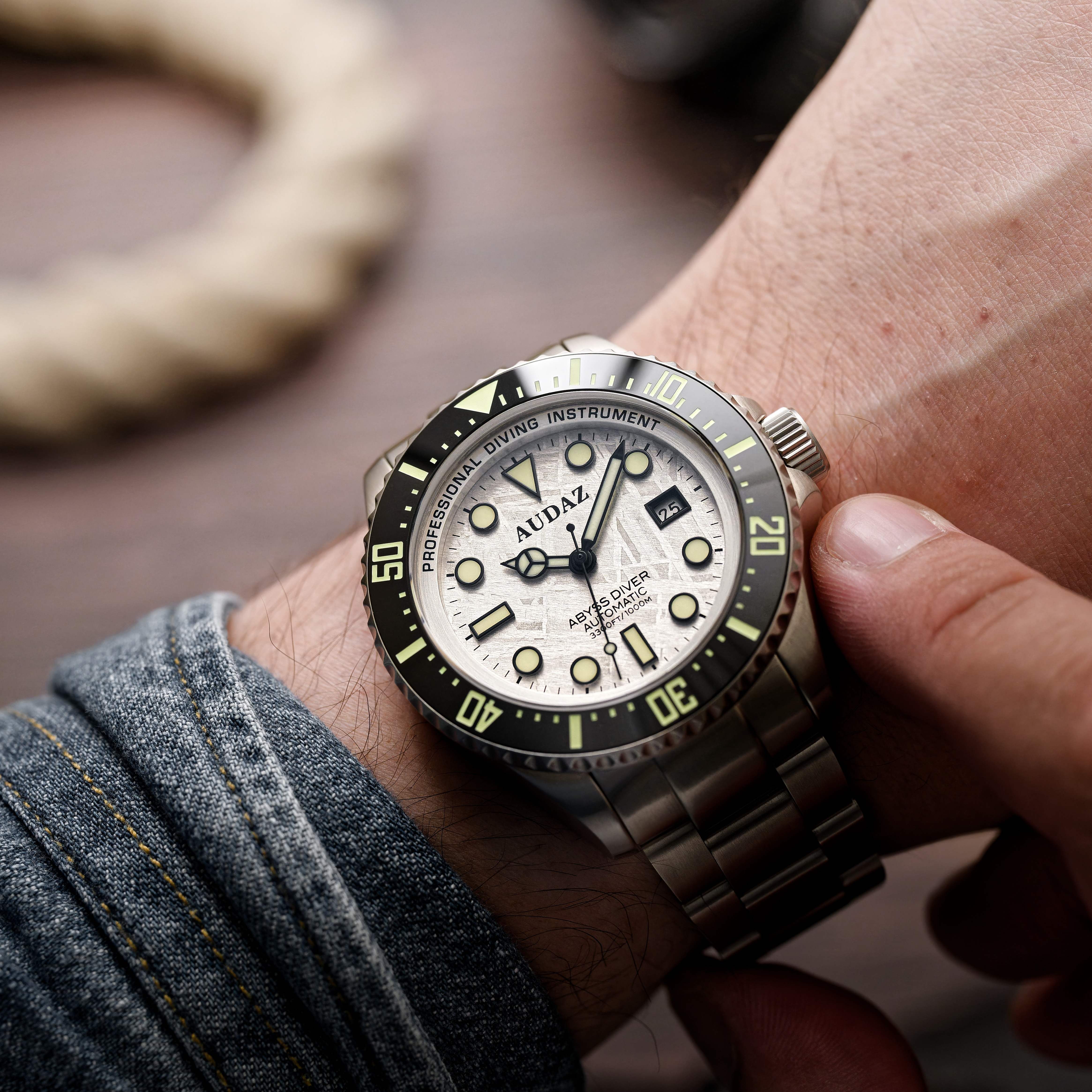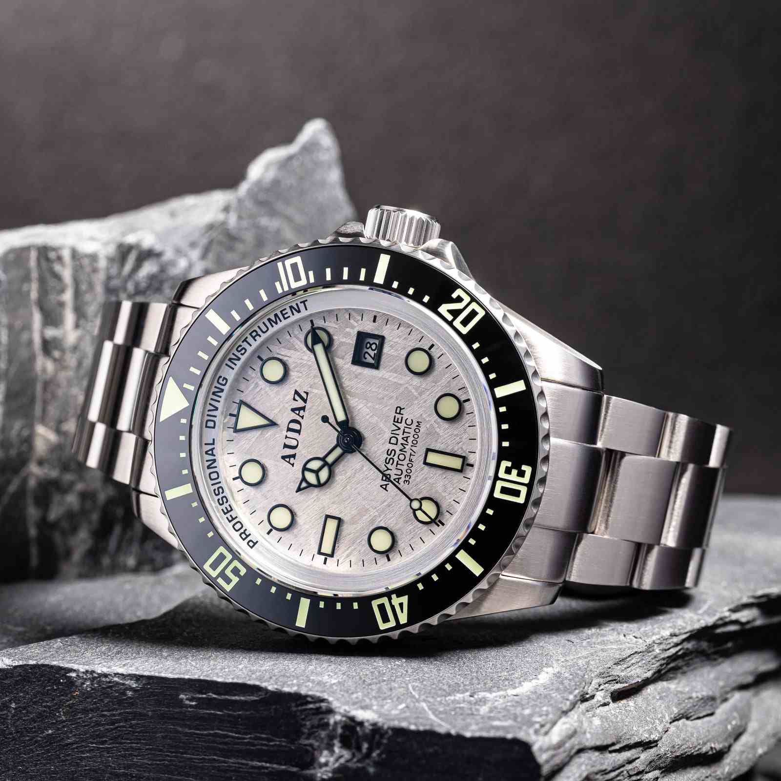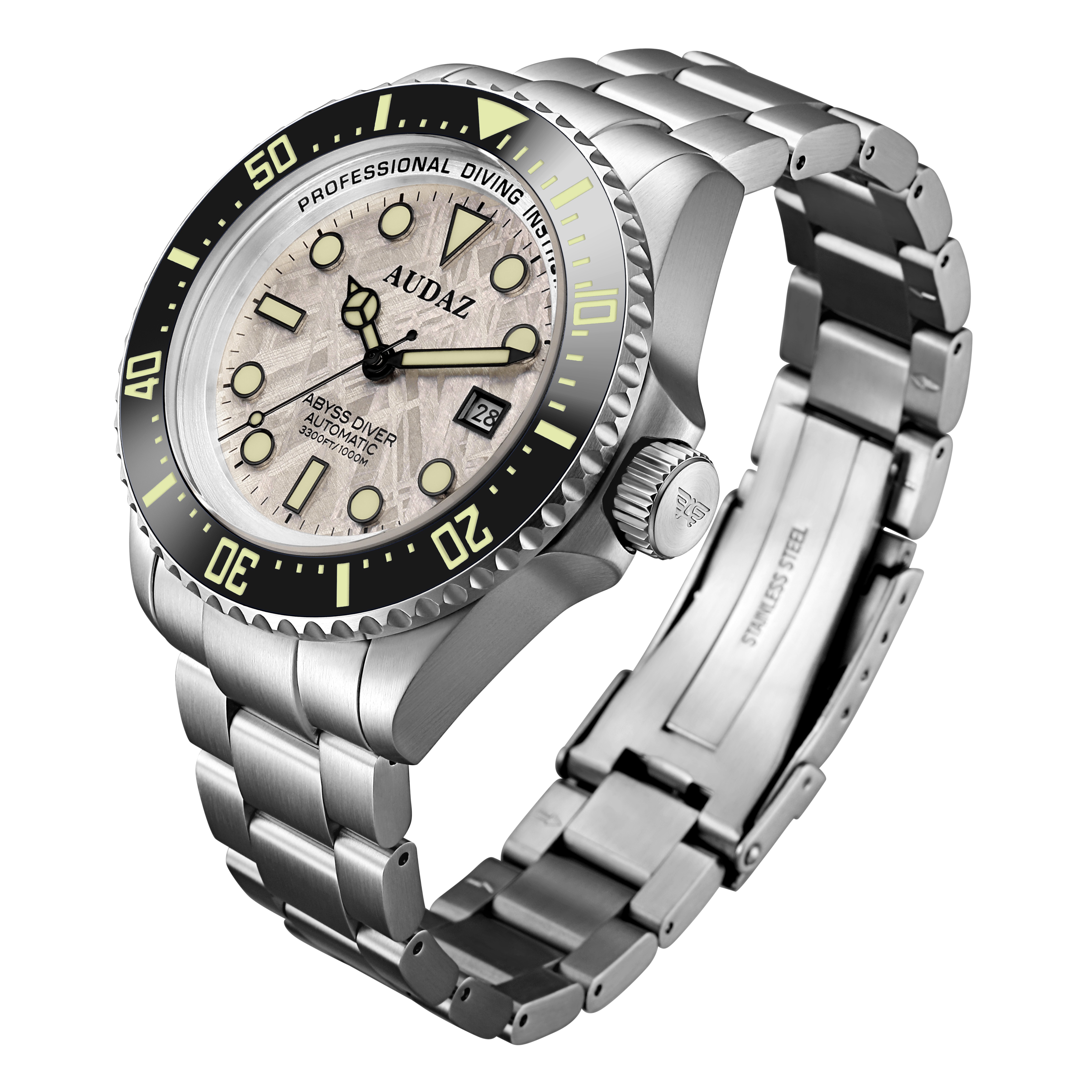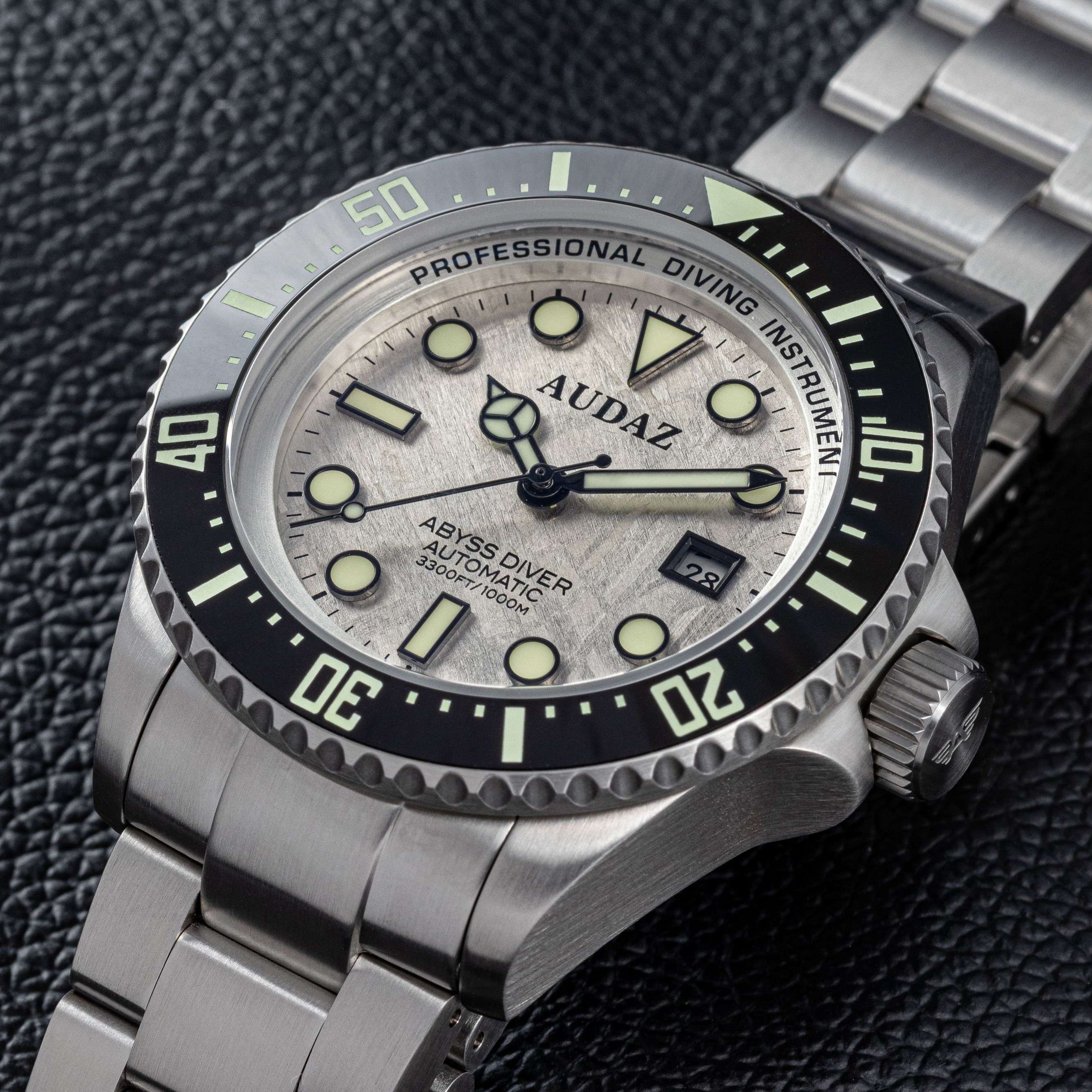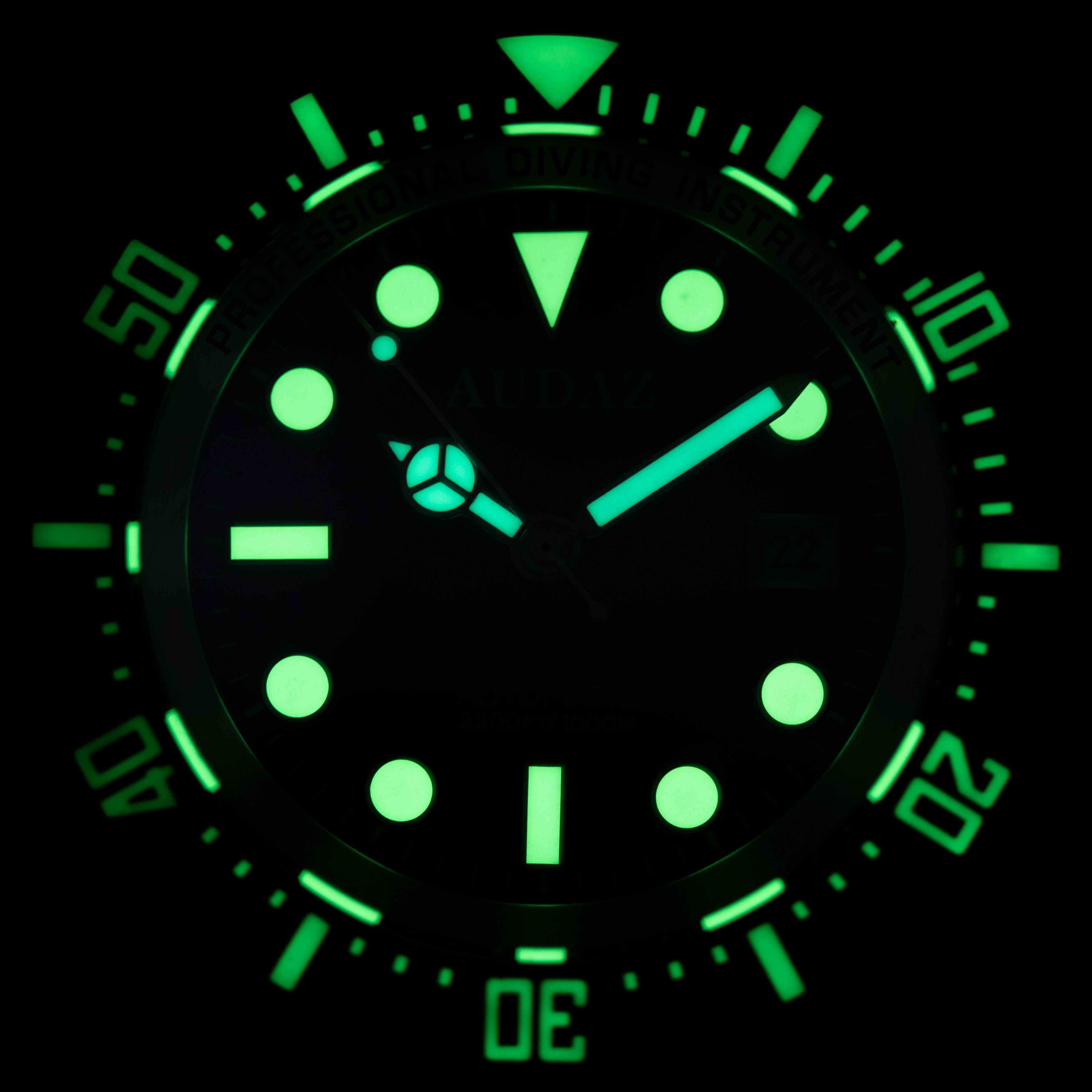 Audaz Watches aspires to breakthrough its own milestones, and is proud to develop an ultra-deep diving timepiece with extreme depth ratings of 100 bar / 1000m water resistance. The Abyss Diver 1000m showcases the brands capabilities and passion for setting new benchmarks. Meticulously detailed and Gloriously built with Exceptional finishing, The Abyss Diver 1000m is the ultimate diving instrument for the professional divers facing unknown challenges exploring the deep seas and is a magnificent timepiece to own for the dive watch aficionados and collectors. Abyss Diver 1000m is built to be indestructible; the watch features a Substantial 44mm size all brush finish case constructed from 316L Stainless Steel material. Turn the watch around and find a solid steel screw-in caseback deeply embossed with Divers Helmet motif adding to the incredible grandeur of this diving masterpiece. Extraordinary Miyota 9015,with a proven legacy powers the Abyss Diver. Undoubtedly this Top Drawer Automatic Movement with 24 Jewels, running at 28800 bph and about 42 hours power reserve is one of the finest Japanese Automatic Movements