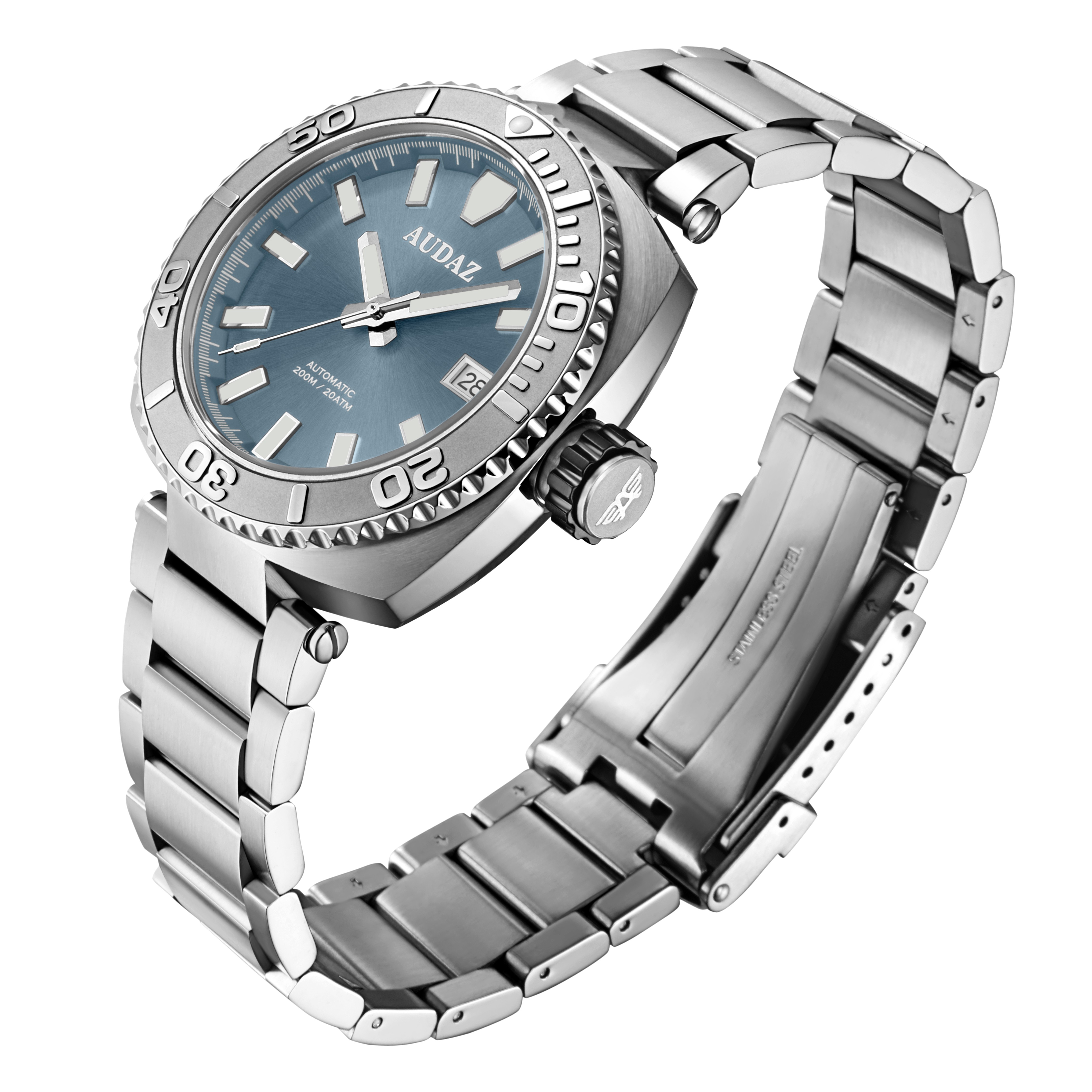 The King Ray Collection is inspired from the Manta Rays, one of the most beautiful creations of marine world. Crafted with a combination of premium quality, robust capabilities and practical functions for everyday adventures of life, The King Ray embodies our Bold DNA and manifests into a Sporty-Sophisticated Dive Watch. Constructed from 316L Stainless Steel, the 42mm cushion case extends upto 48m in length making it a pleasant piece to wear all day comfortably. The robust case is supported with a elegant three link, brushed, polished stainless steel bracelet. King Ray watches are designed to be elegant and functional at the same time, the clutter free details and the generous use of Super-LumiNova on the diamond cut hands and applied indices, reinforce the legibility even in low light conditions. The dials come in Sunray finish that blends perfectly with polished hands and indices, or with an excellent Matt finish on dials, hands and indices. The minute chapter ring and polished date frame compliment the dials elegance. Powerful design needs to backed by functionality, King Ray Watches are built to take upto 200m of atmospheric pressure underwater, the watch also features aesthetically pleasing Manta Ray motif embossed on the Solid Screw-in caseback. King Ray dive watches are powered by 24-Jewel, well-engineered TMI-NH35 Automatic movements that are also popularly known as the workhorse automatic movement. The unidirectional bezel features a stainless-steel insert with raised polished graduations and numerals, standing out against the matt background adding to its functionality.