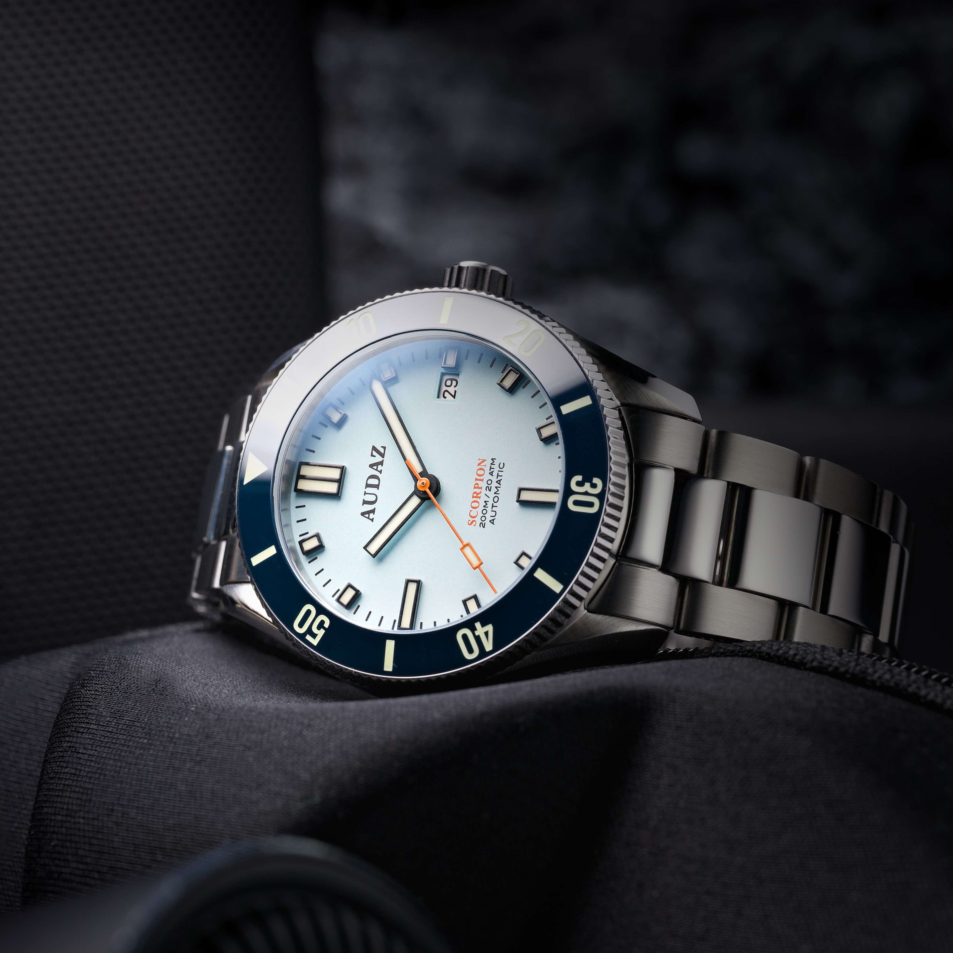 The Scorpion dive watch epitomizes the essence of a timepiece tailored for the discerning urban gentry. It effortlessly combines functionality with style, making it the perfect companion for both professional pursuits and underwater adventures. At a sleek 40mm in width and a mere 12mm in height, its exquisitely designed case offers unparalleled comfort for everyday wear. Moreover, the Scorpion stands out with its impeccable finish, where a harmonious blend of satin brushing and mirror polishing creates a captivating and opulent high-street aesthetic.