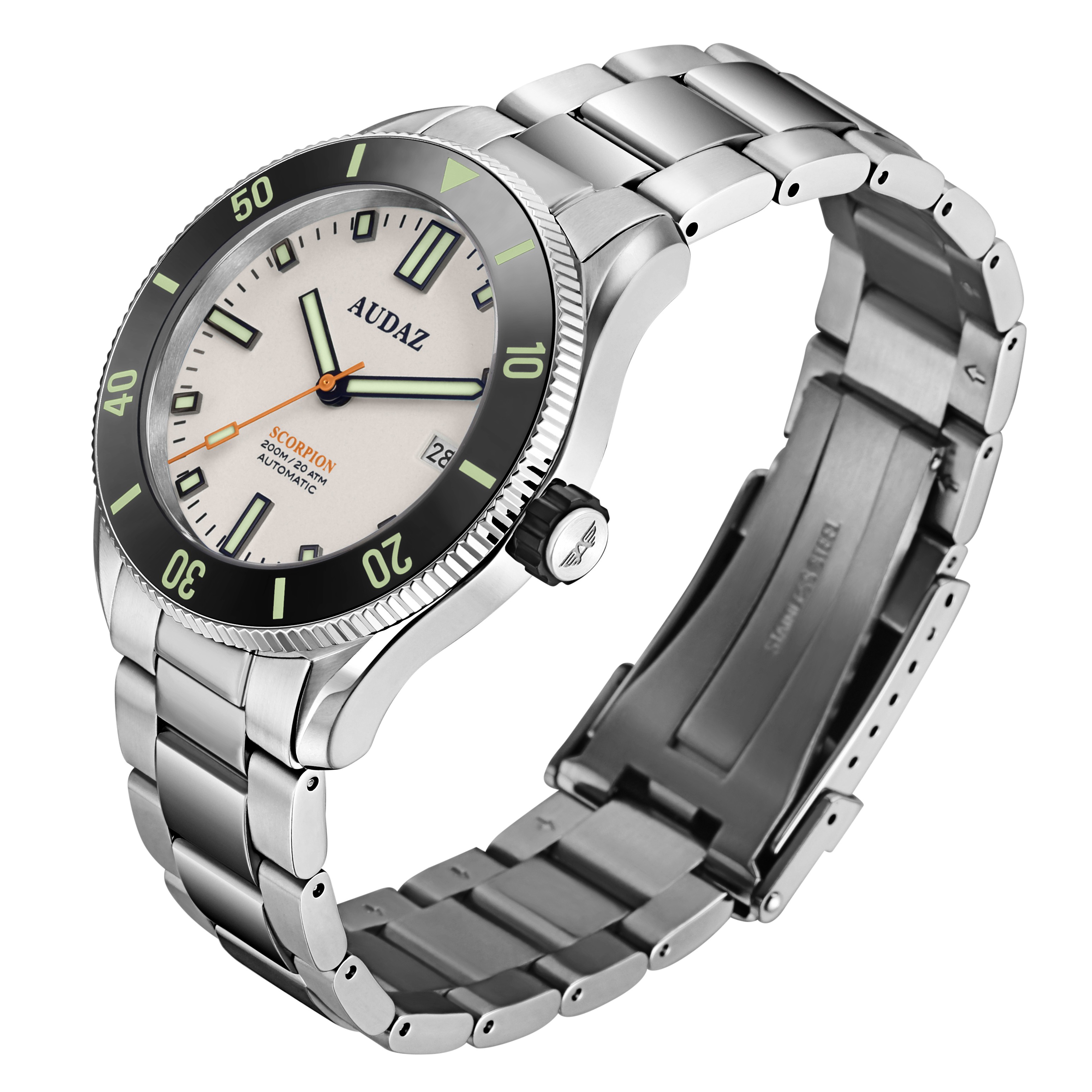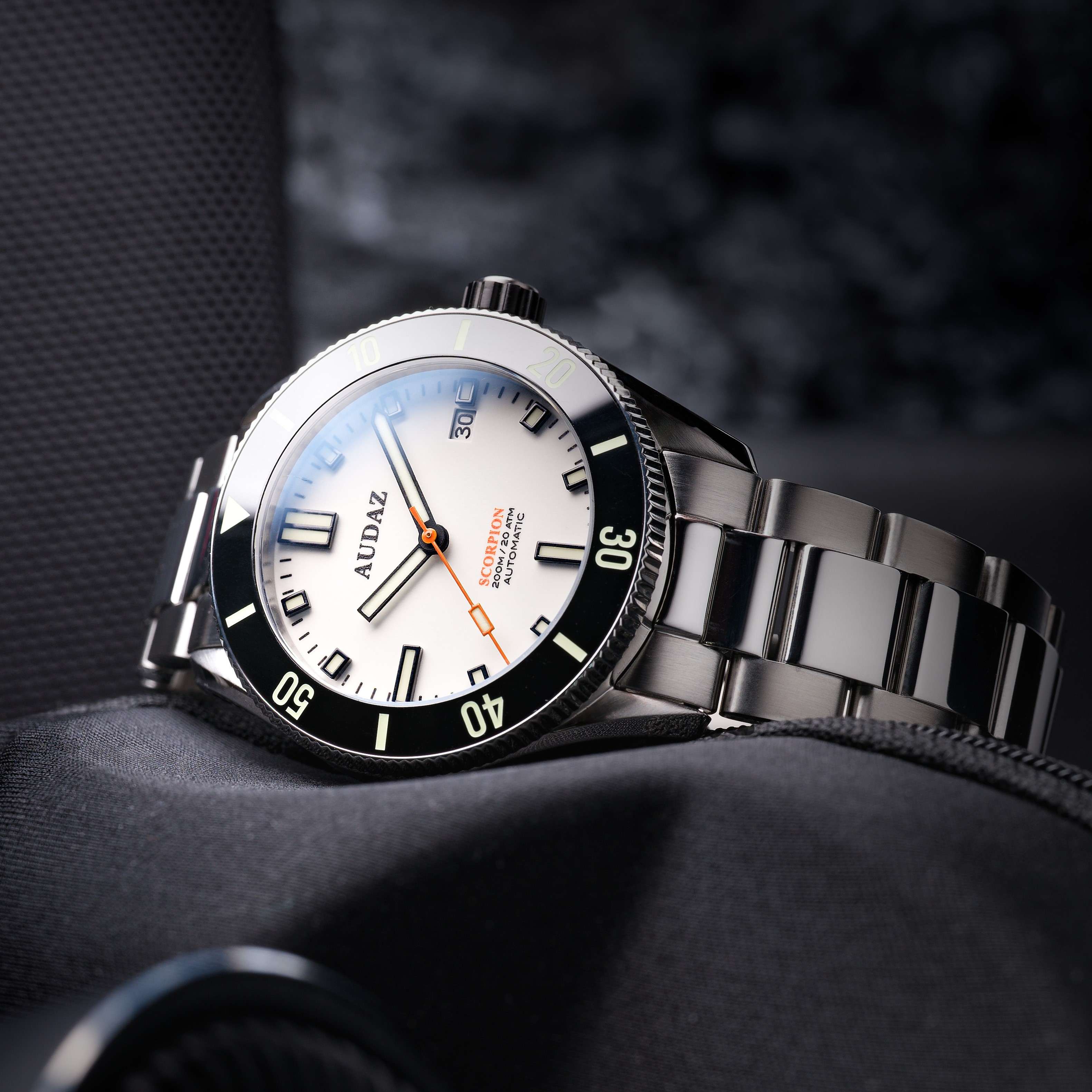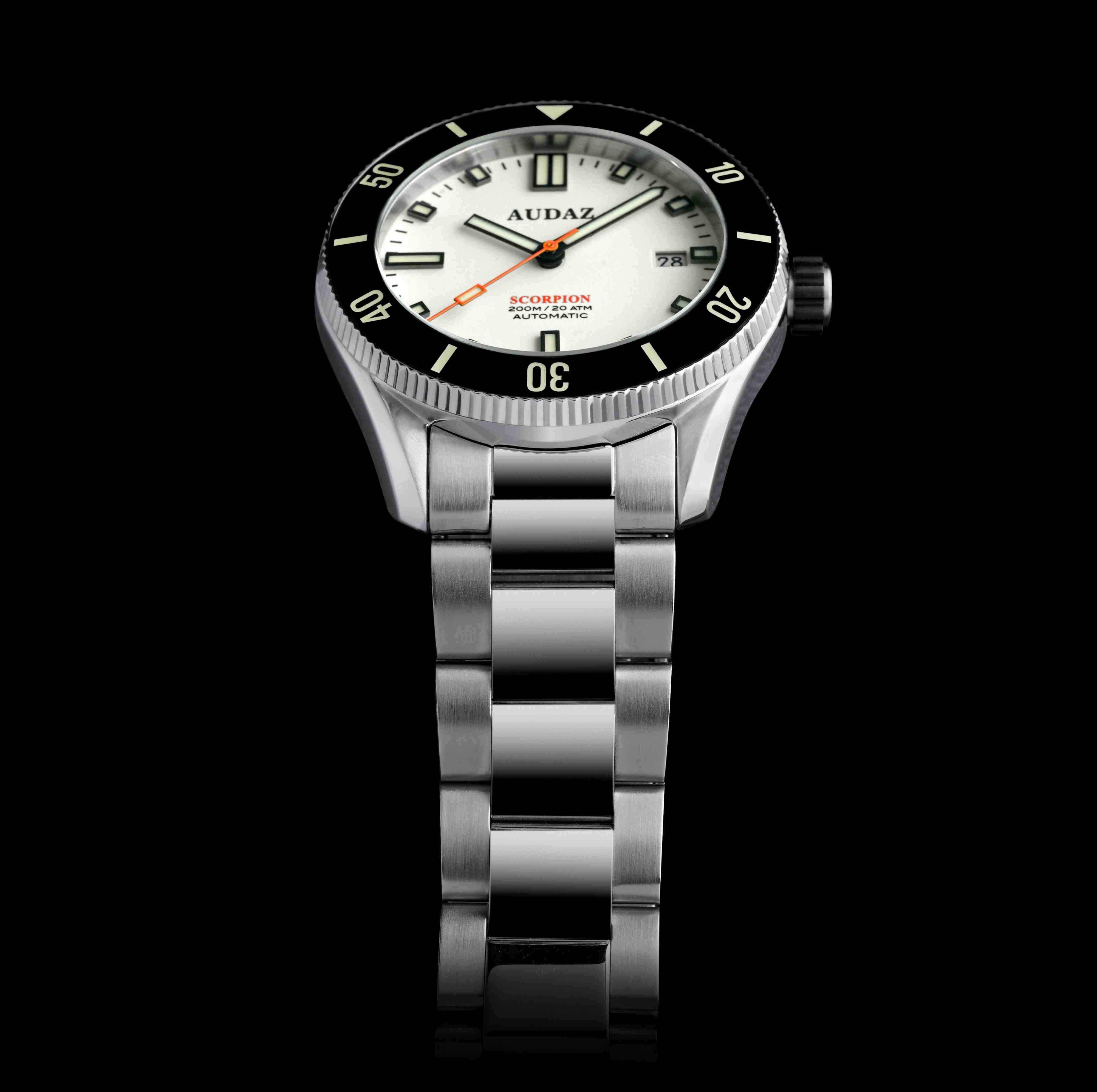 The Scorpion dive watch epitomizes the essence of a timepiece tailored for the discerning urban gentry. It effortlessly combines functionality with style, making it the perfect companion for both professional pursuits and underwater adventures. At a sleek 40mm in width and a mere 12mm in height, its exquisitely designed case offers unparalleled comfort for everyday wear. Moreover, the Scorpion stands out with its impeccable finish, where a harmonious blend of satin brushing and mirror polishing creates a captivating and opulent high-street aesthetic.