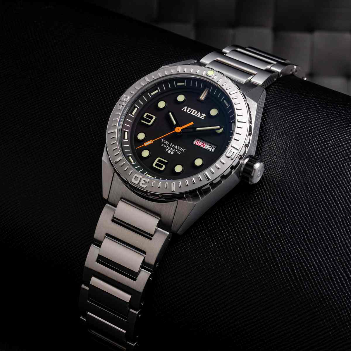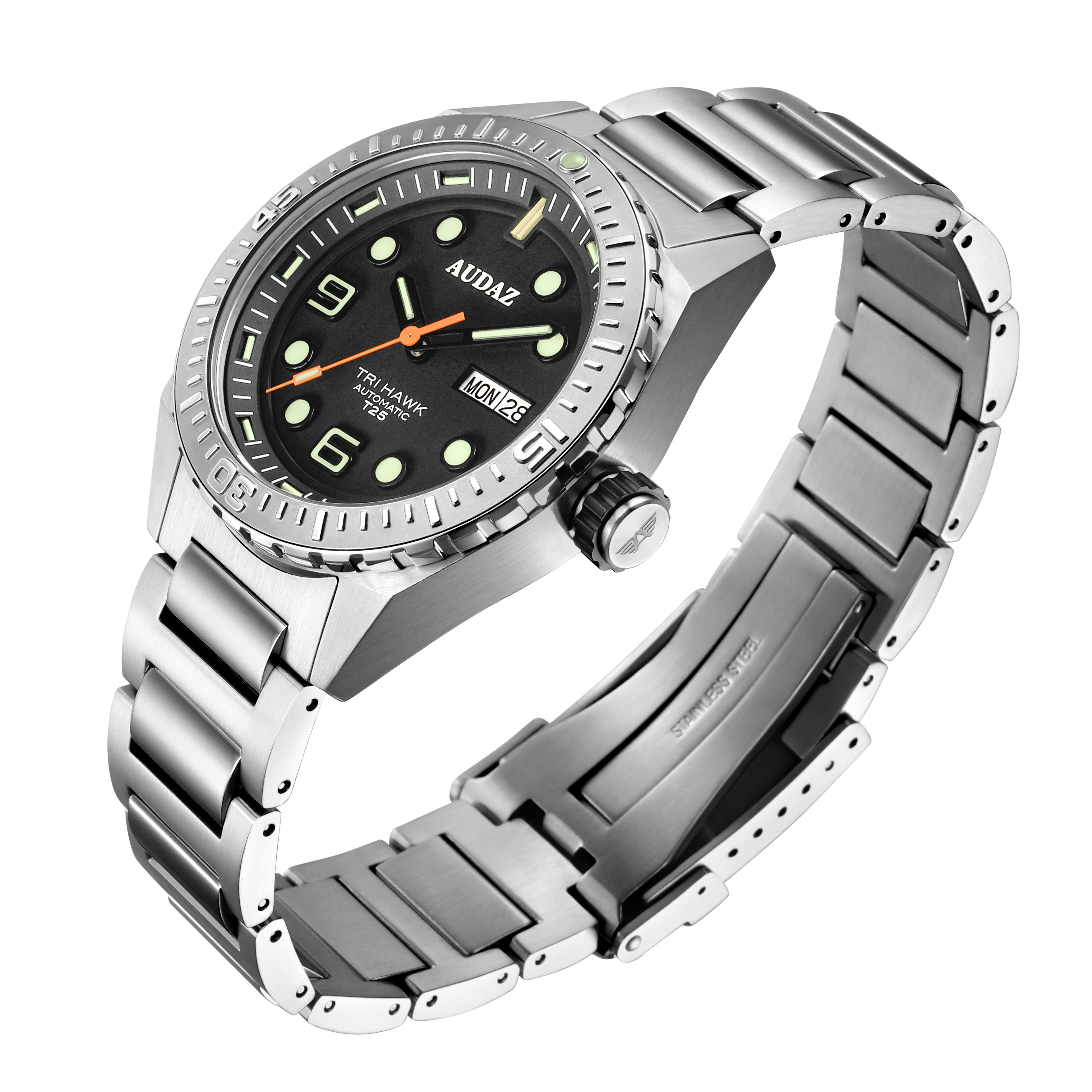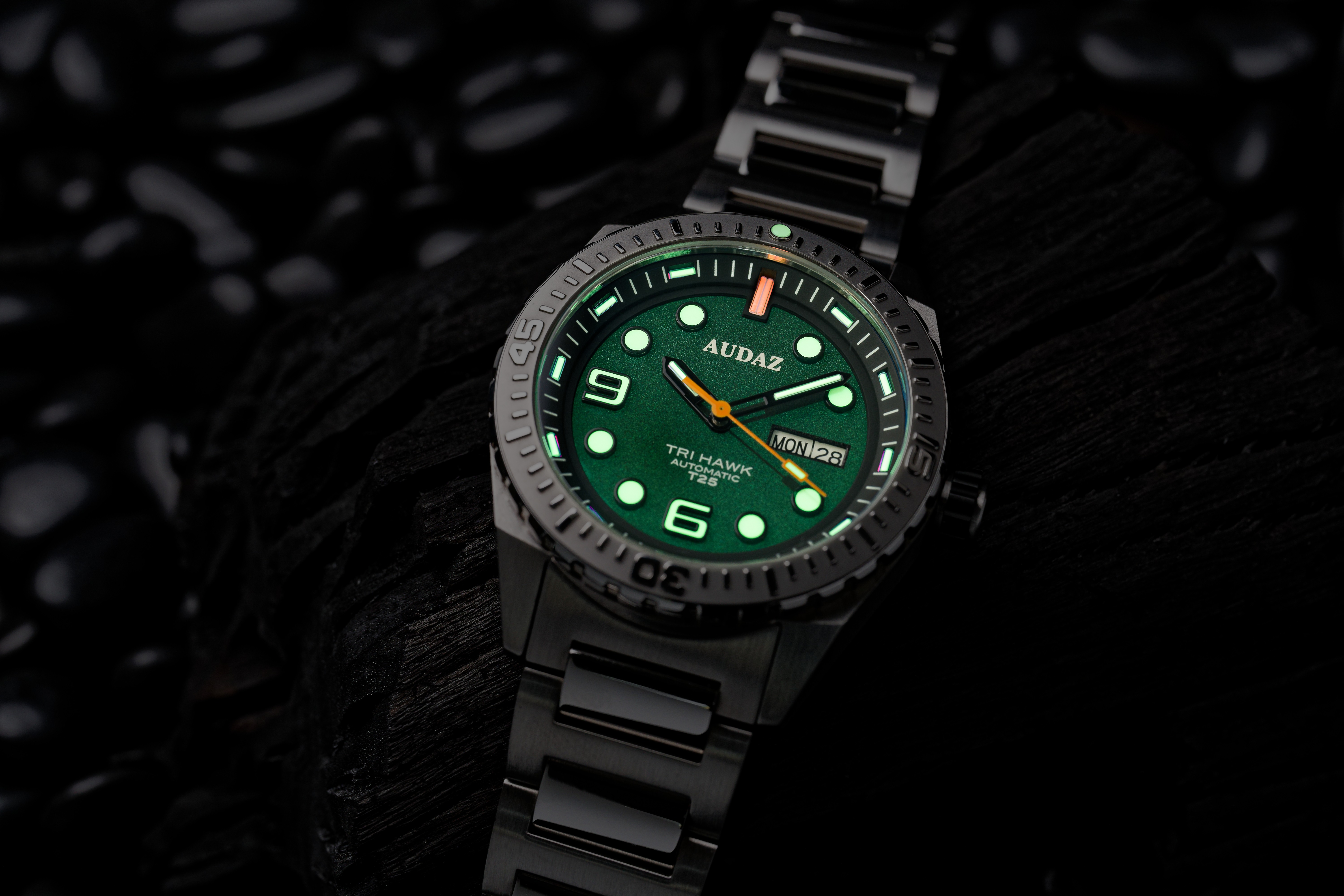 The Tri-Hawk T25 collection is designed for exploration and fun below the deck. Crafted with a combination of splendid finishing, rugged capabilities and functionality of a tool watch, The Tri-Hawk showcases our Bold DNA and transcends into Sporty Diver Watch. Constructed from 316L Stainless Steel, the 43mm substantial case extends up to 14mm in height making it effortlessly slide under the shirt cuffs easily. The robust case is supported with an elegant H-link, brushed, polished stainless-steel bracelet. Tri-Hawk T25 dive watches are designed to amaze you with their spectacular luminosity in the dark, the clutter free details, cool color combinations, the generous use of Super-LumiNova on the dial and applied indices, with tritium tube hands, the Tri-Hawk will outperform the traditional divers and reinforce the long-lasting legibility in low light conditions. The dial is balanced out with a Day-Date window at 3 position, the watch face is protected by a scratch resistant sapphire crystal with AR coating. The Unidirectional bezel is complimented by stainless steel inserts with raised polished graduations against matt background adding to dive functionality. With sensational looks, the Tri-Hawk dive watches also combine high performance capabilities to withstand upto 200m atmospheric pressure underwater. The exhibition caseback displays the remarkable view of the 24-jewel, Day-Date featured TMI – NH36 Automatic movement that is known for its durability. The Tri-Hawk series delivers a lume powerhouse with practicality of a rugged diver watch.
