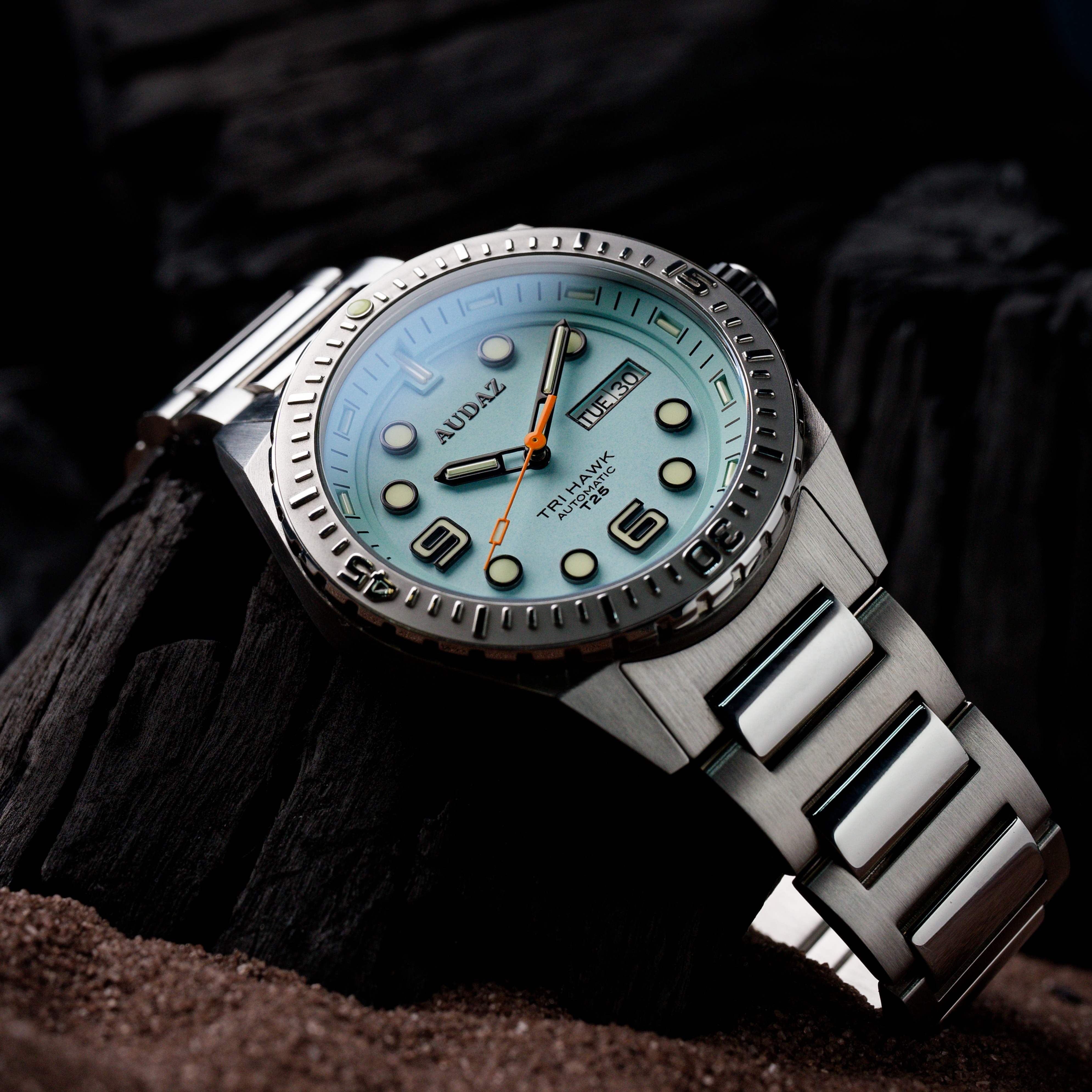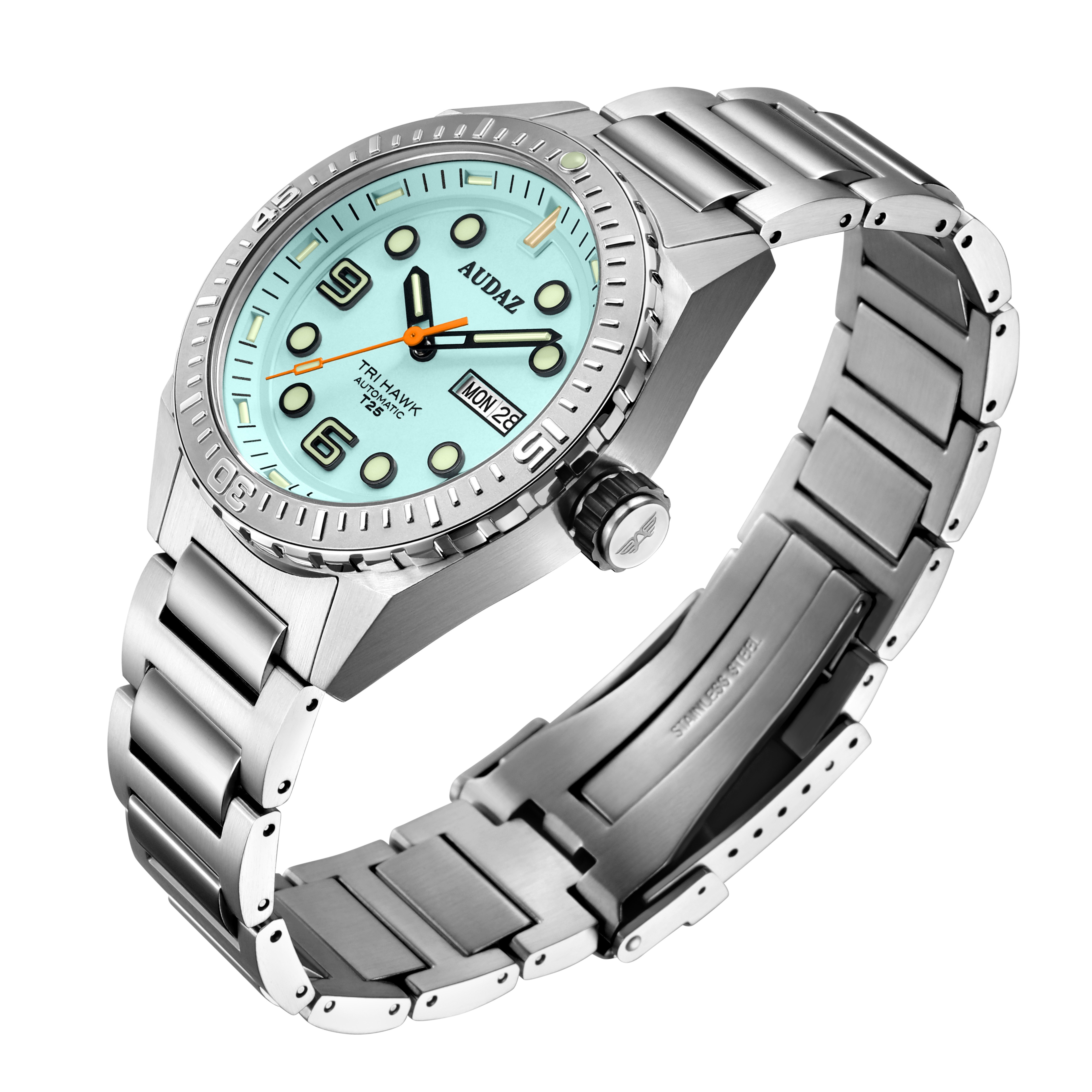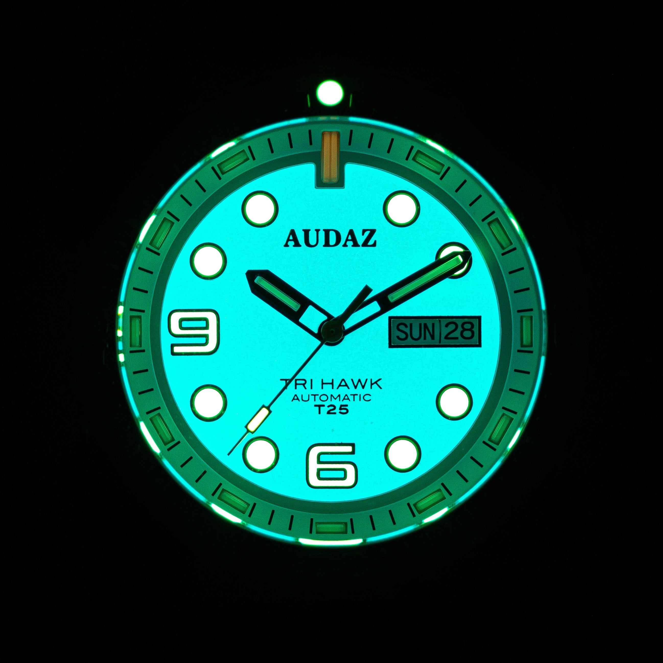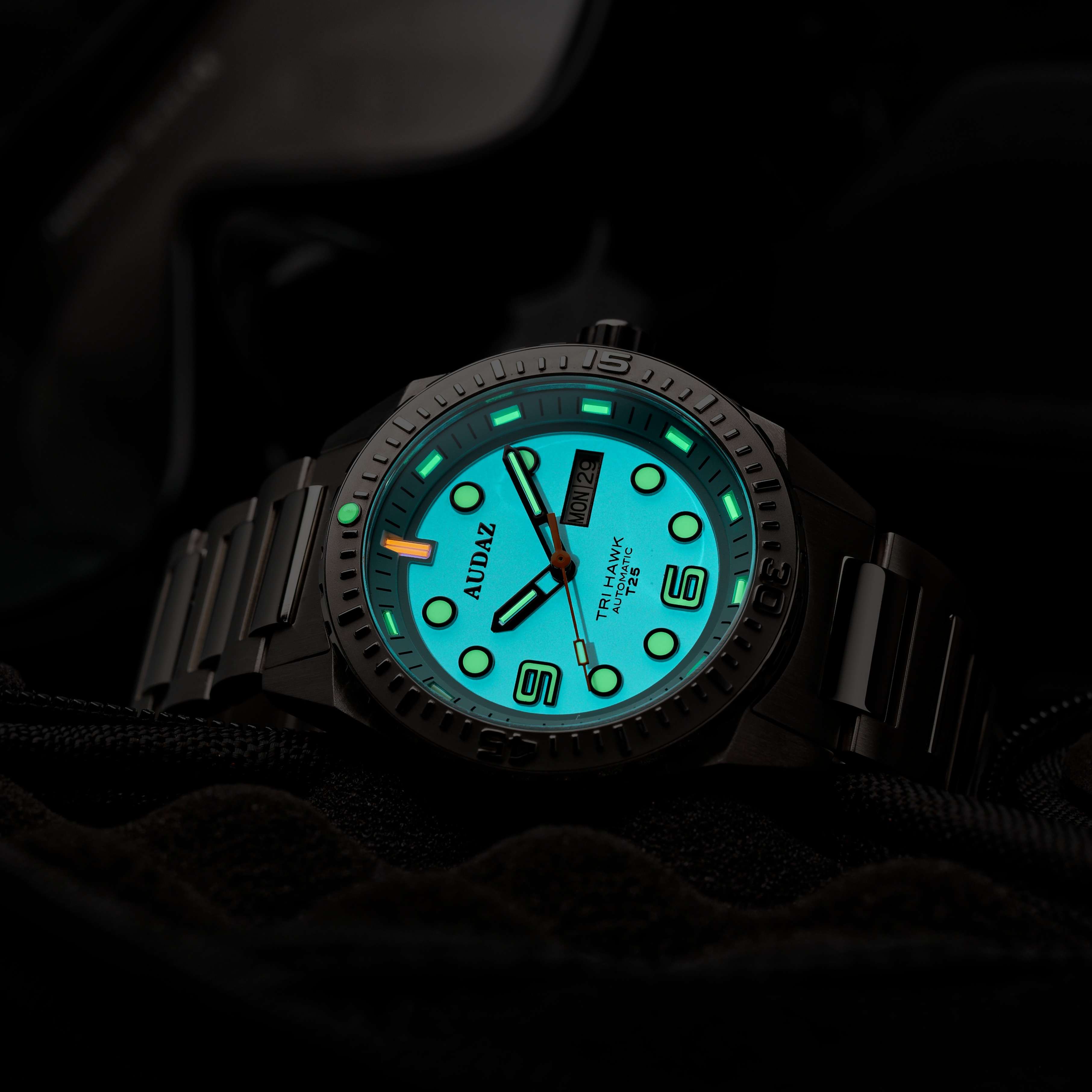The Tri-Hawk T25 collection is designed for exploration and fun below the deck. Crafted with a combination of splendid finishing, rugged capabilities and functionality of a tool watch, The Tri-Hawk showcases our Bold DNA and transcends into Sporty Diver Watch. Constructed from 316L Stainless Steel, the 43mm substantial case extends up to 14mm in height making it effortlessly slide under the shirt cuffs easily. The robust case is supported with an elegant H-link, brushed, polished stainless-steel bracelet. Tri-Hawk T25 dive watches are designed to amaze you with their spectacular luminosity in the dark, the clutter free details, cool color combinations, the generous use of Super-LumiNova on the dial and applied indices, with tritium tube hands, the Tri-Hawk will outperform the traditional divers and reinforce the long-lasting legibility in low light conditions. The dial is balanced out with a Day-Date window at 3 position, the watch face is protected by a scratch resistant sapphire crystal with AR coating. The Unidirectional bezel is complimented by stainless steel inserts with raised polished graduations against matt background adding to dive functionality. With sensational looks, the Tri-Hawk dive watches also combine high performance capabilities to withstand upto 200m atmospheric pressure underwater. The exhibition caseback displays the remarkable view of the 24-jewel, Day-Date featured TMI – NH36 Automatic movement that is known for its durability. The Tri-Hawk series delivers a lume powerhouse with practicality of a rugged diver watch.