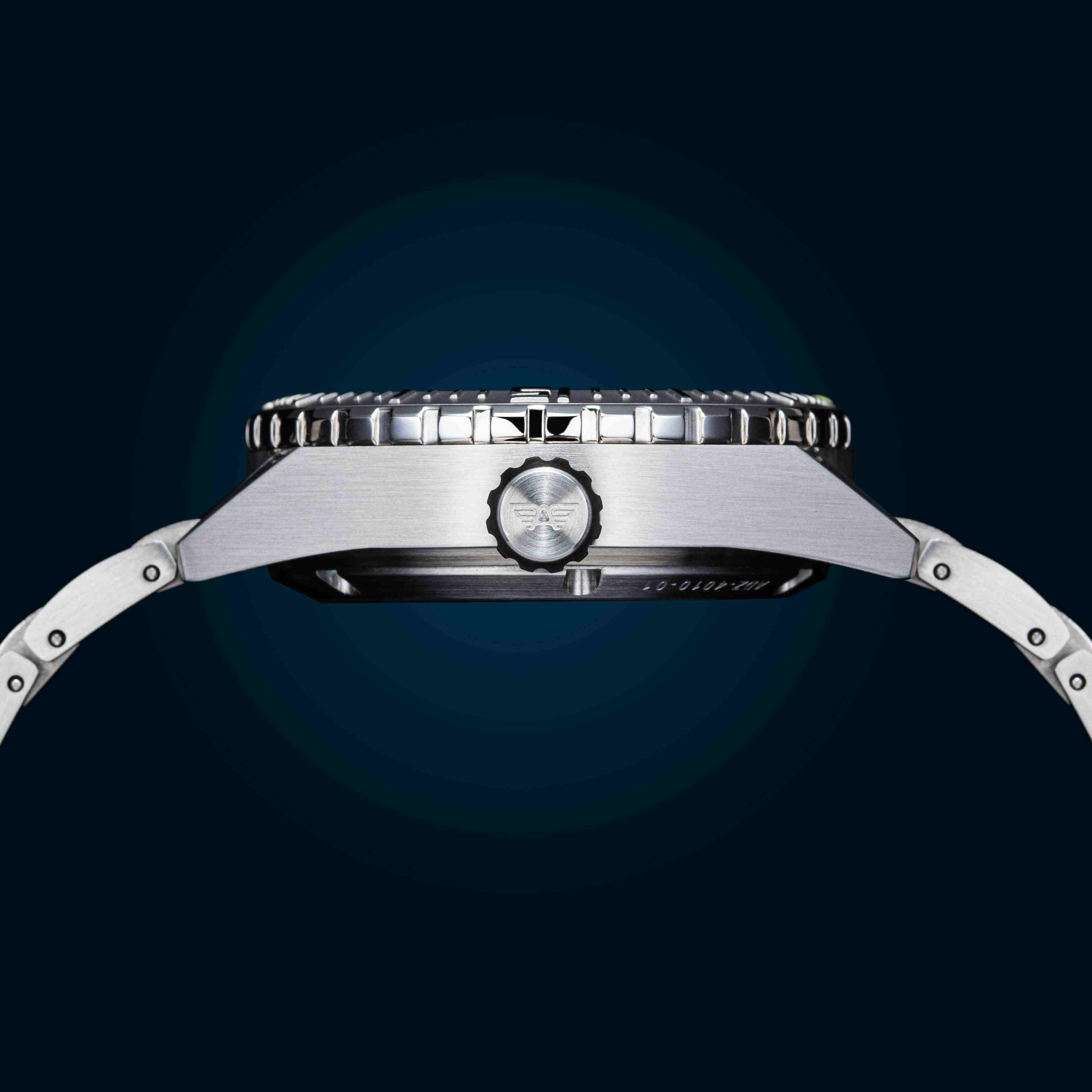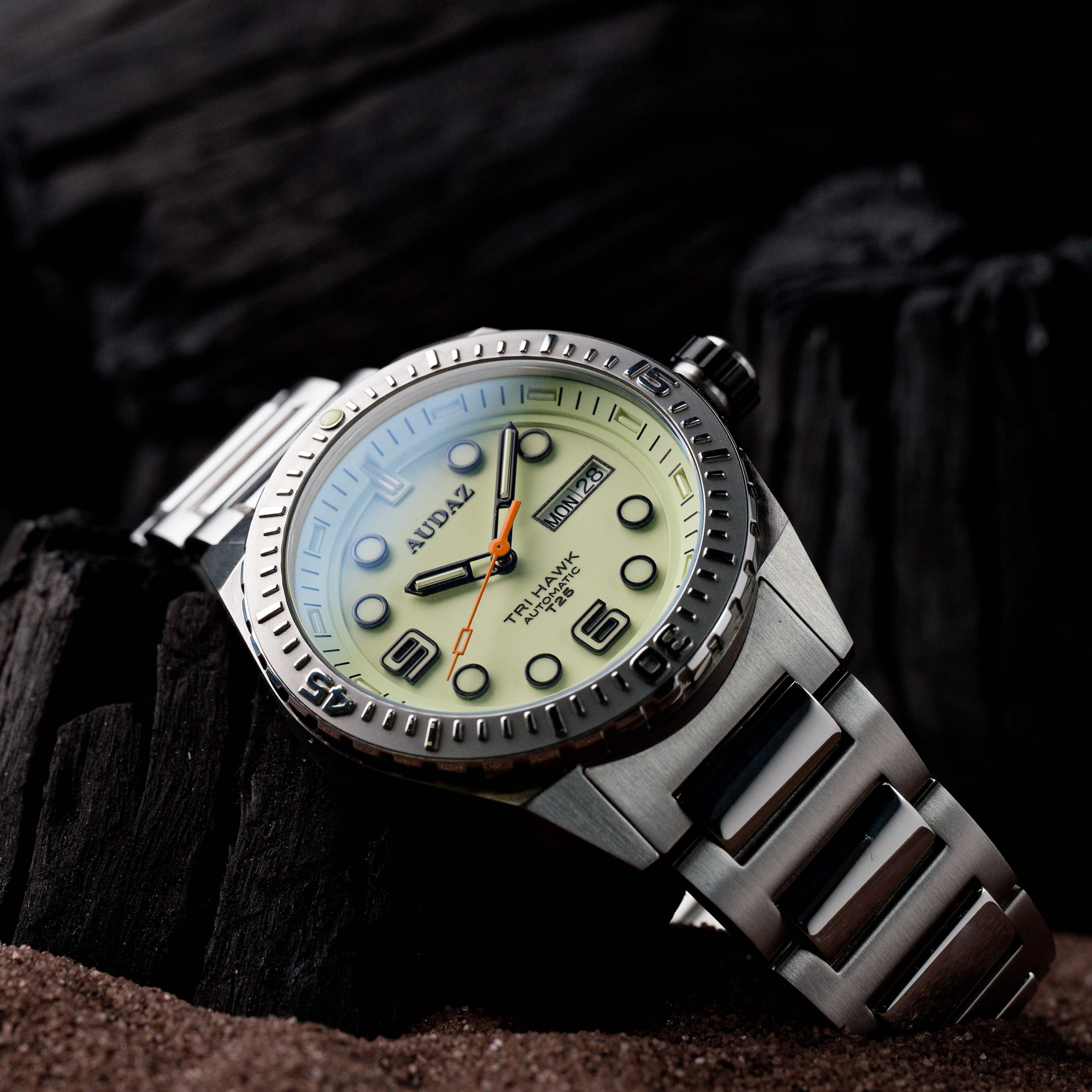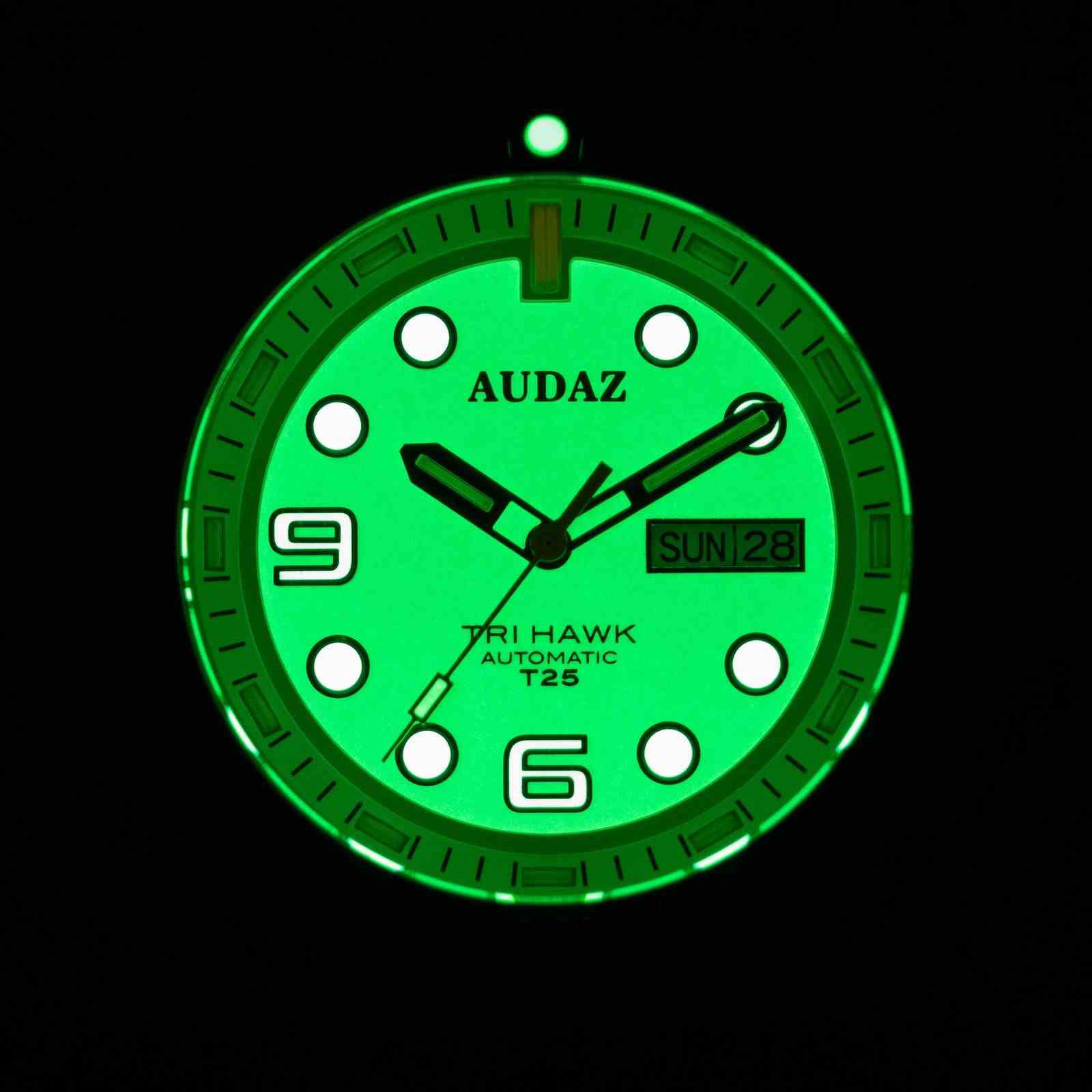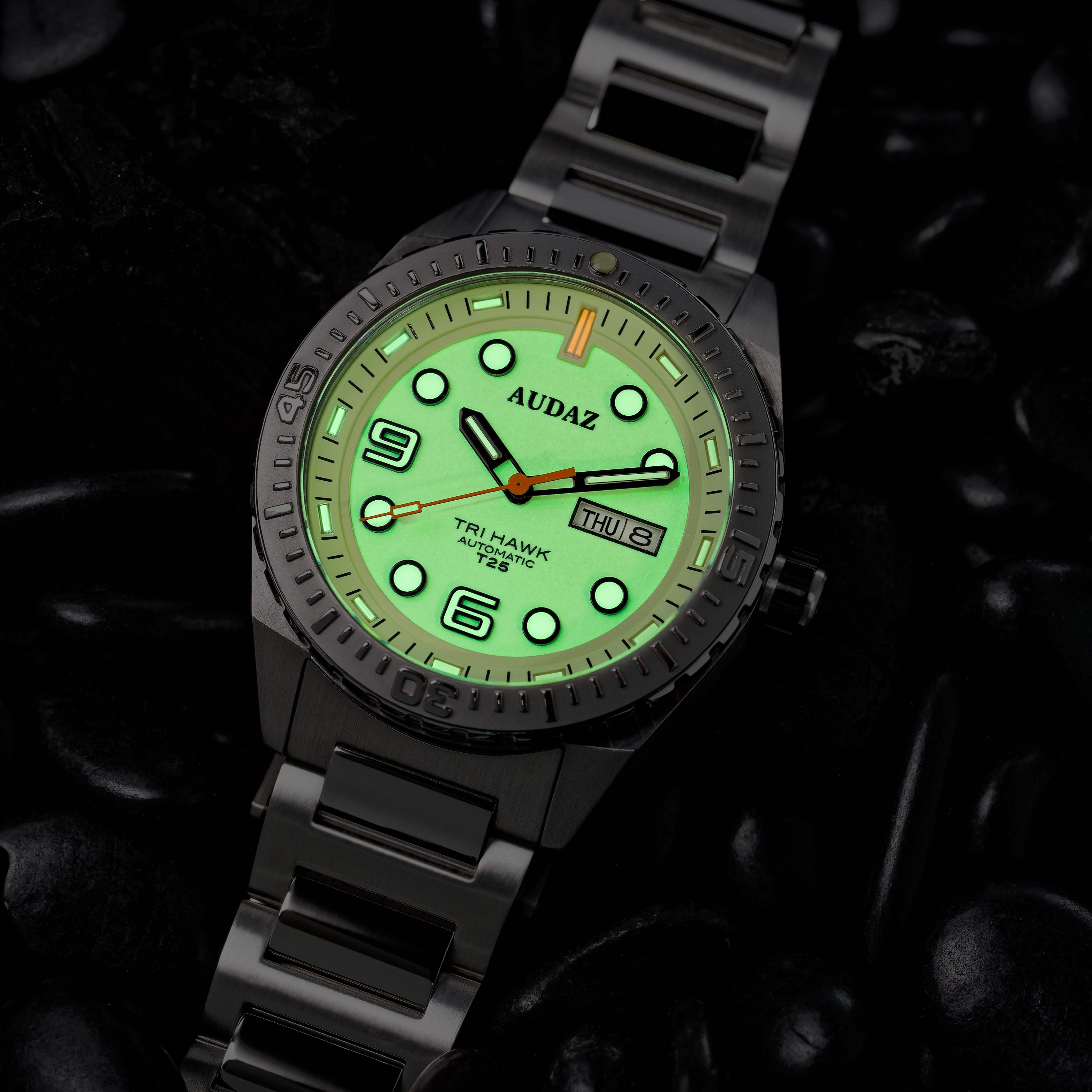 The Tri-Hawk T25 collection is designed for exploration and fun below the deck. Crafted with a combination of splendid finishing, rugged capabilities and functionality of a tool watch, The Tri-Hawk showcases our Bold DNA and transcends into Sporty Diver Watch. Constructed from 316L Stainless Steel, the 43mm substantial case extends up to 14mm in height making it effortlessly slide under the shirt cuffs easily. The robust case is supported with an elegant H-link, brushed, polished stainless-steel bracelet. Tri-Hawk T25 dive watches are designed to amaze you with their spectacular luminosity in the dark, the clutter free details, cool color combinations, the generous use of Super-LumiNova on the dial and applied indices, with tritium tube hands, the Tri-Hawk will outperform the traditional divers and reinforce the long-lasting legibility in low light conditions. The dial is balanced out with a Day-Date window at 3 position, the watch face is protected by a scratch resistant sapphire crystal with AR coating. The Unidirectional bezel is complimented by stainless steel inserts with raised polished graduations against matt background adding to dive functionality. With sensational looks, the Tri-Hawk dive watches also combine high performance capabilities to withstand upto 200m atmospheric pressure underwater. The exhibition caseback displays the remarkable view of the 24-jewel, Day-Date featured TMI – NH36 Automatic movement that is known for its durability. The Tri-Hawk series delivers a lume powerhouse with practicality of a rugged diver watch.
