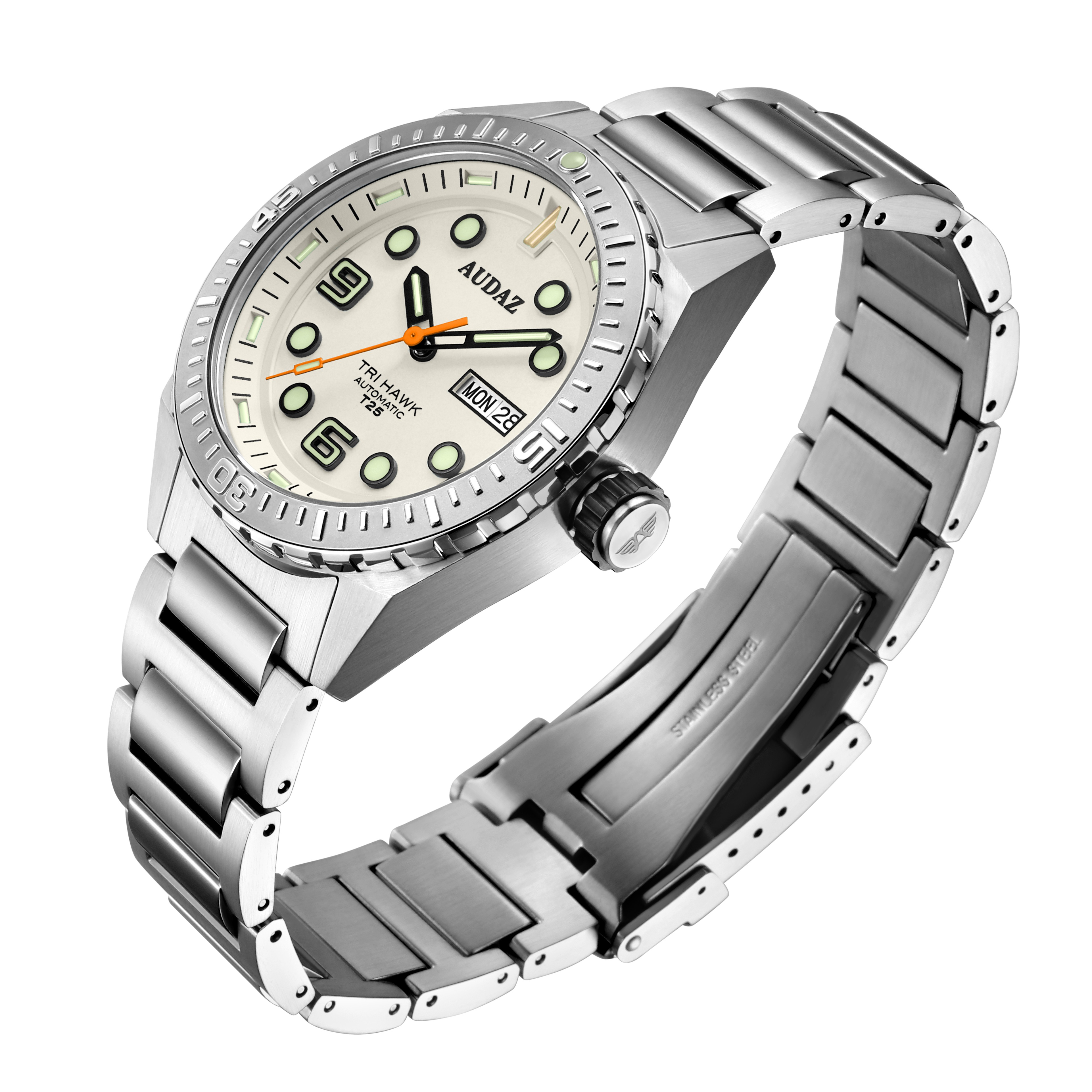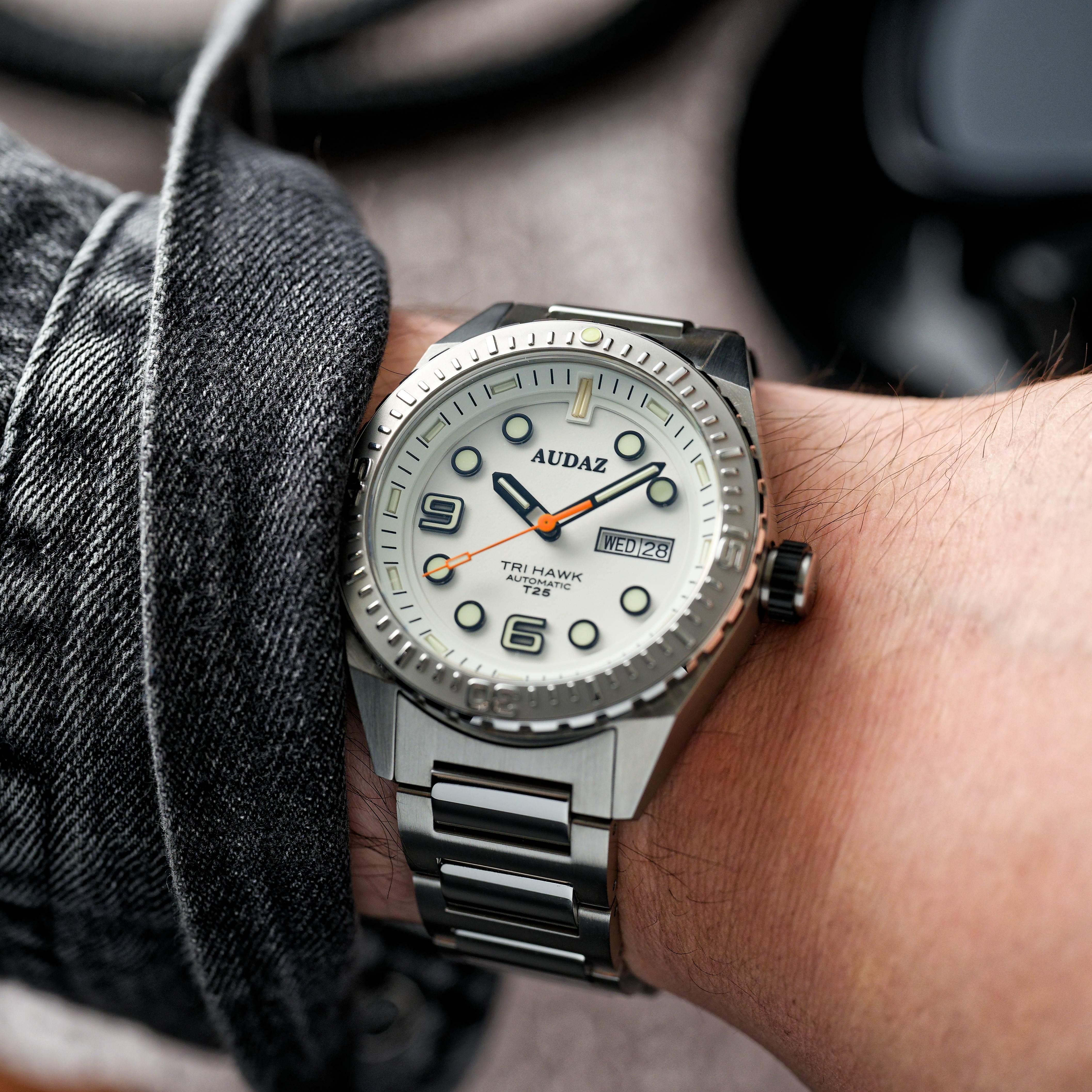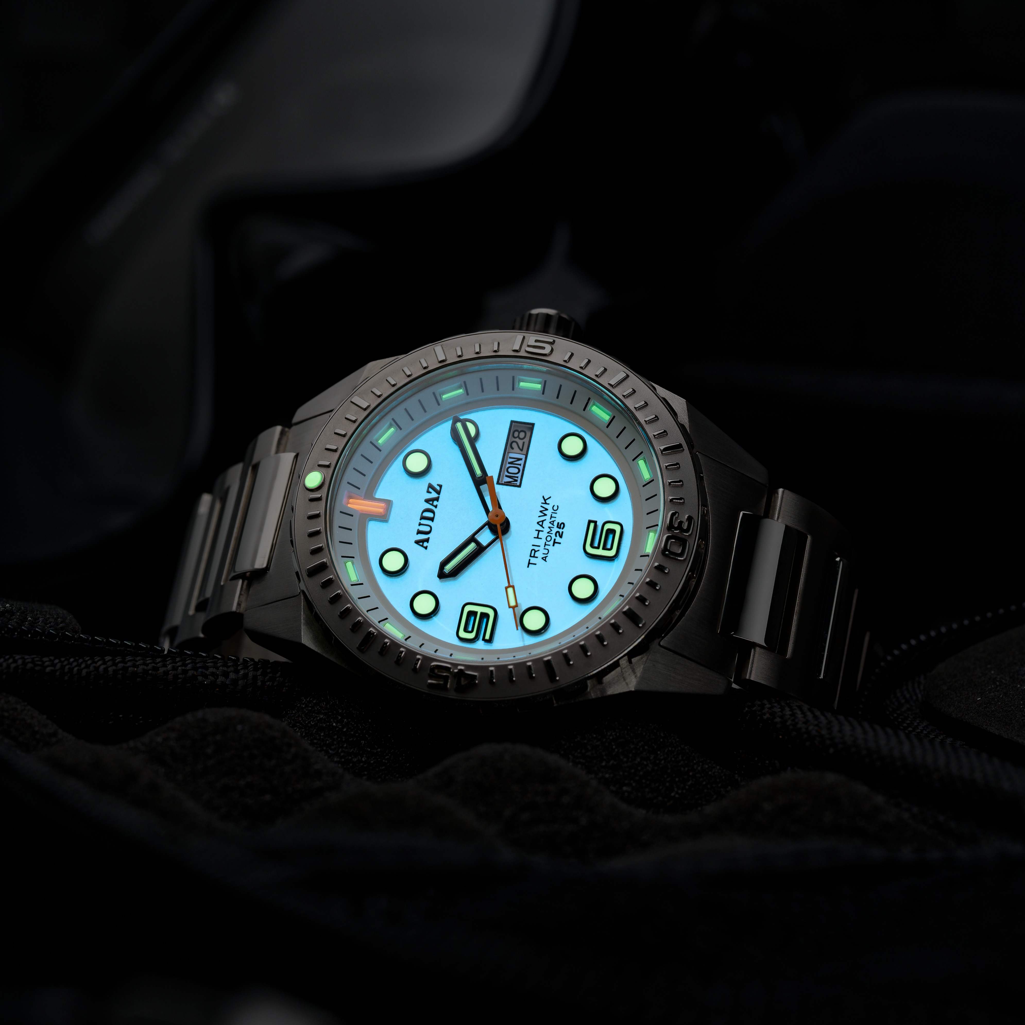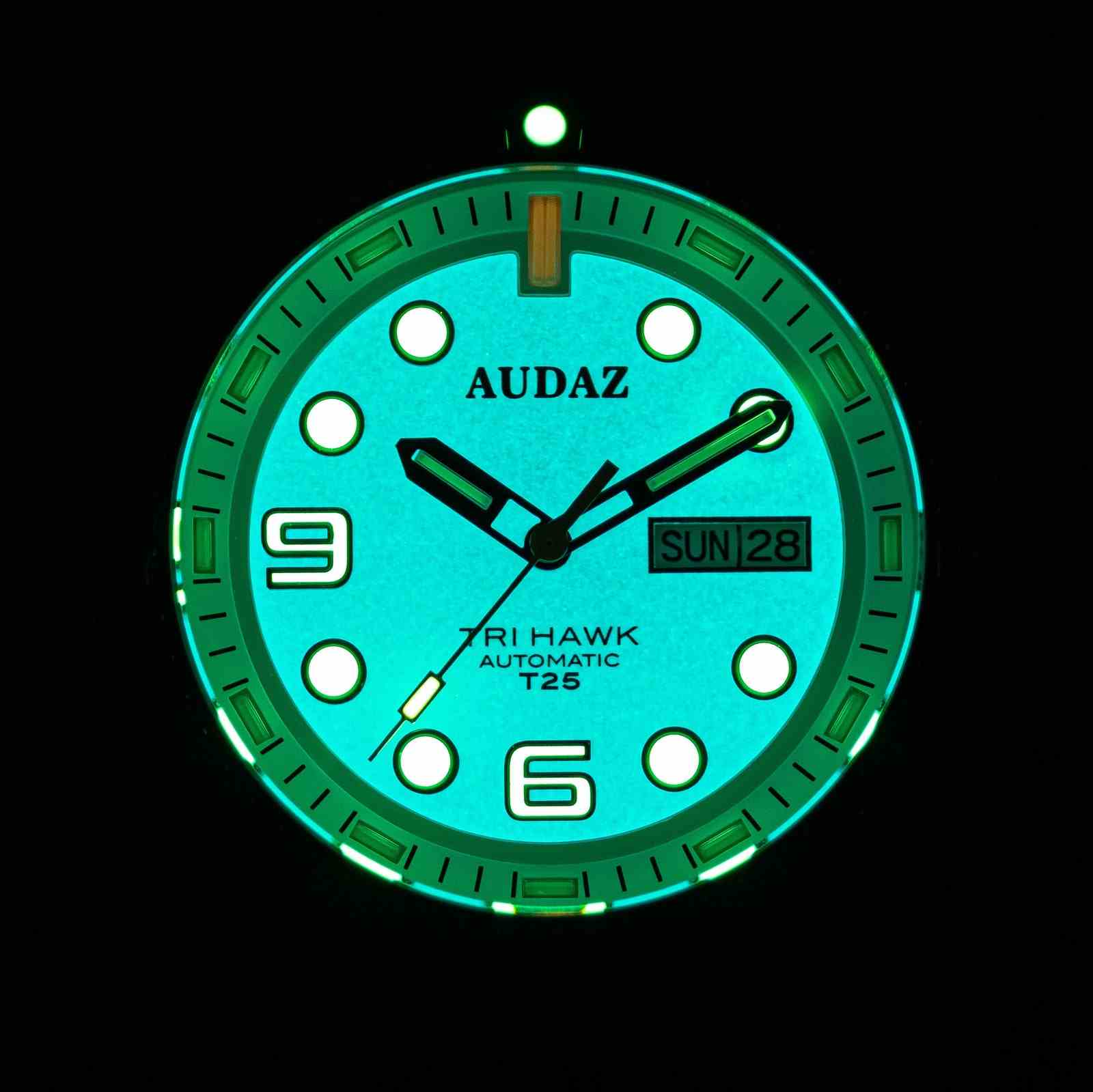 The Tri-Hawk T25 collection is designed for exploration and fun below the deck. Crafted with a combination of splendid finishing, rugged capabilities and functionality of a tool watch, The Tri-Hawk showcases our Bold DNA and transcends into Sporty Diver Watch. Constructed from 316L Stainless Steel, the 43mm substantial case extends up to 14mm in height making it effortlessly slide under the shirt cuffs easily. The robust case is supported with an elegant H-link, brushed, polished stainless-steel bracelet. Tri-Hawk T25 dive watches are designed to amaze you with their spectacular luminosity in the dark, the clutter free details, cool color combinations, the generous use of Super-LumiNova on the dial and applied indices, with tritium tube hands, the Tri-Hawk will outperform the traditional divers and reinforce the long-lasting legibility in low light conditions. The dial is balanced out with a Day-Date window at 3 position, the watch face is protected by a scratch resistant sapphire crystal with AR coating. The Unidirectional bezel is complimented by stainless steel inserts with raised polished graduations against matt background adding to dive functionality. With sensational looks, the Tri-Hawk dive watches also combine high performance capabilities to withstand upto 200m atmospheric pressure underwater. The exhibition caseback displays the remarkable view of the 24-jewel, Day-Date featured TMI – NH36 Automatic movement that is known for its durability. The Tri-Hawk series delivers a lume powerhouse with practicality of a rugged diver watch.