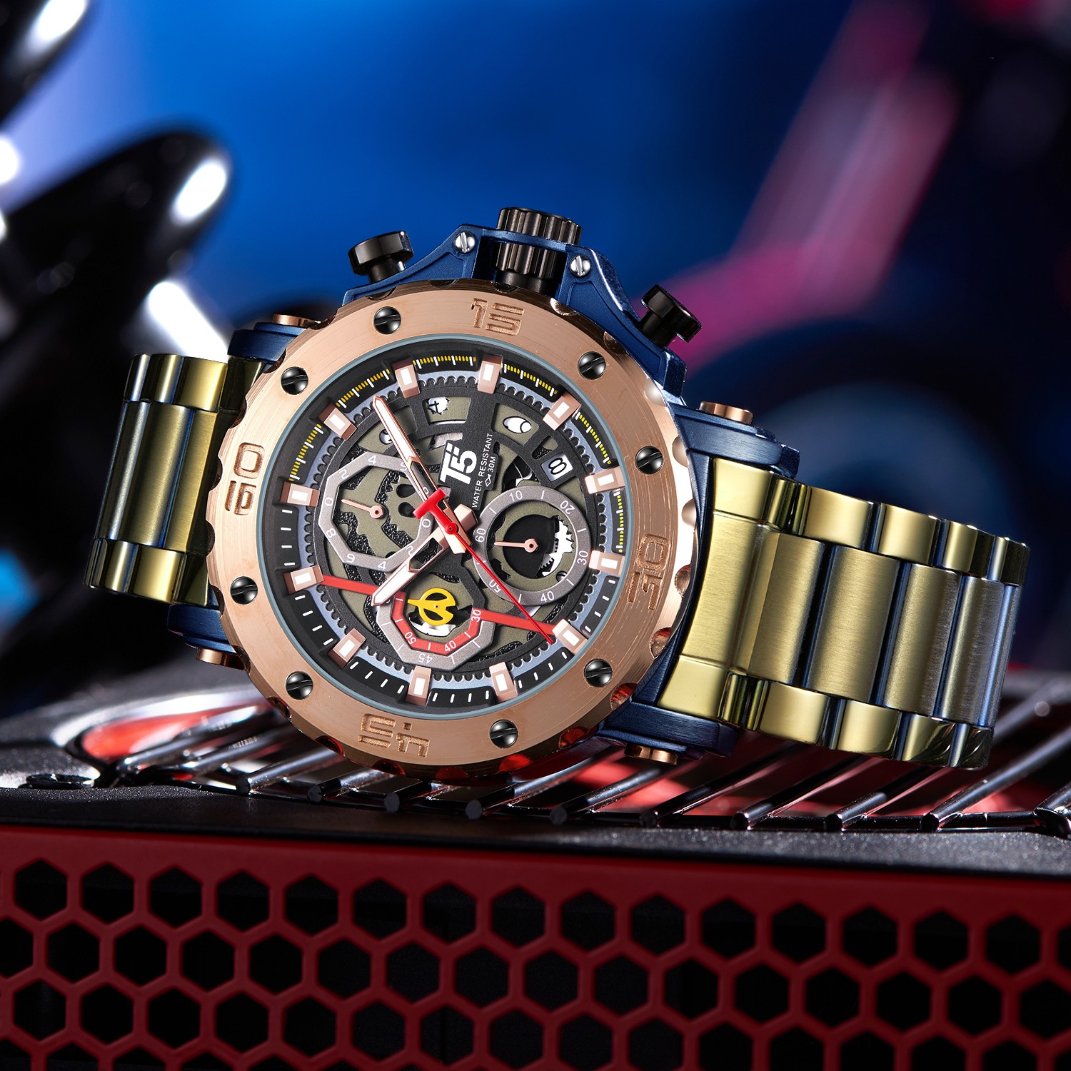 The T5 H3723G is a sophisticated men's chronograph that boasts a 47mm alloy case paired with a stainless steel strap and a secure deployant clasp. Driven by quartz movement, it offers accurate timekeeping, complemented by a durable mineral glass face. Its 30-meter water resistance and classic round design make it a versatile accessory for any wardrobe.