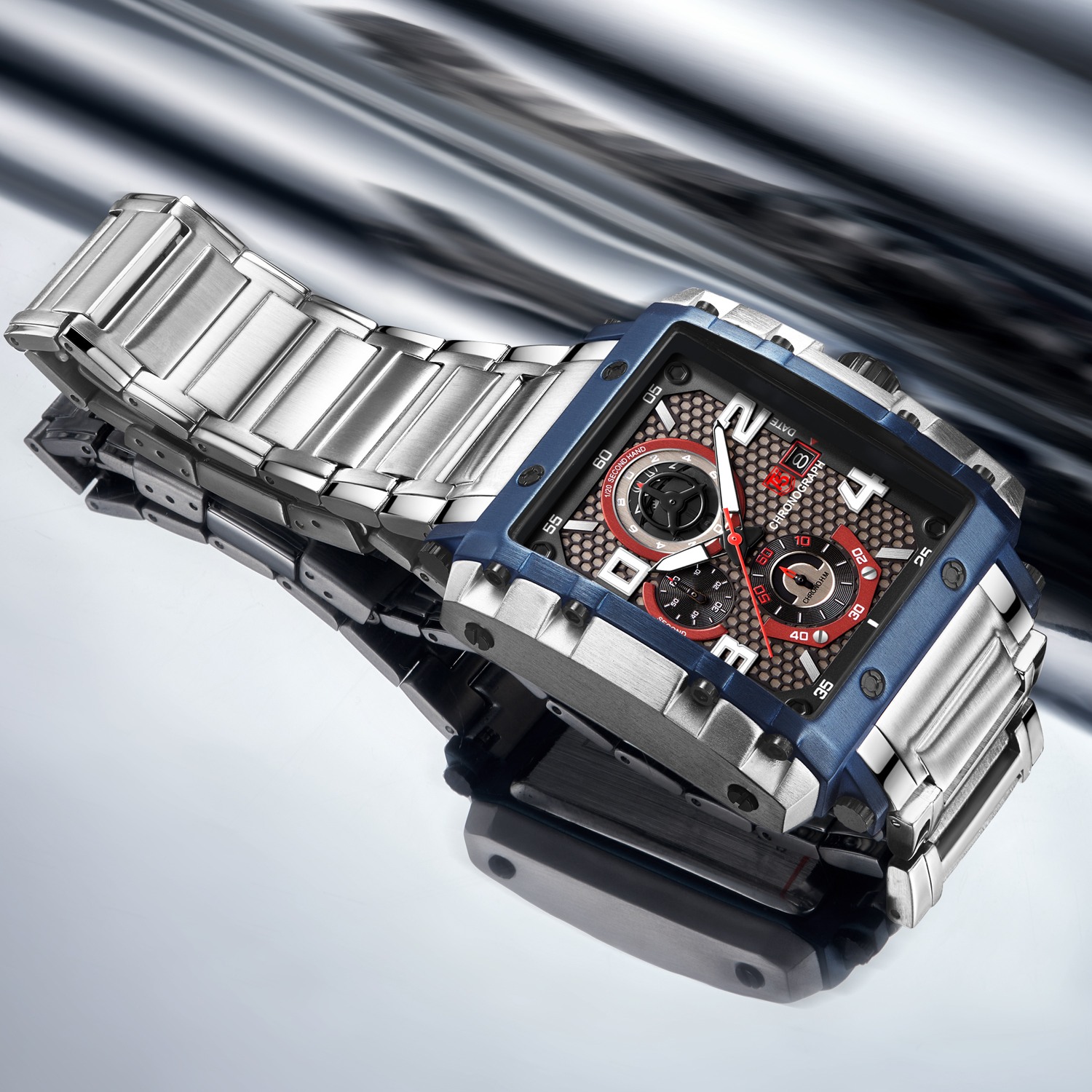 The T5 H3802G sets itself apart with its unique rectangular case and modern chronograph features. Built for durability, the stainless steel alloy case, quartz movement, and 30m water resistance, it offers both style and functionality for any outfit.
