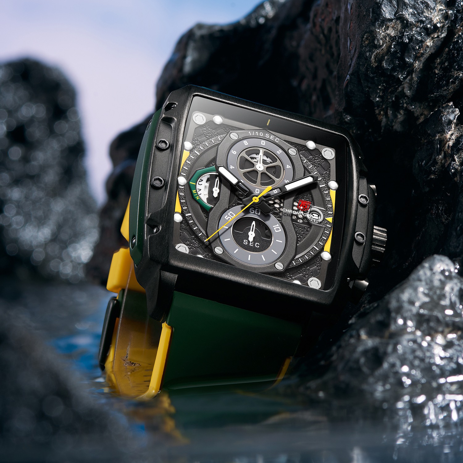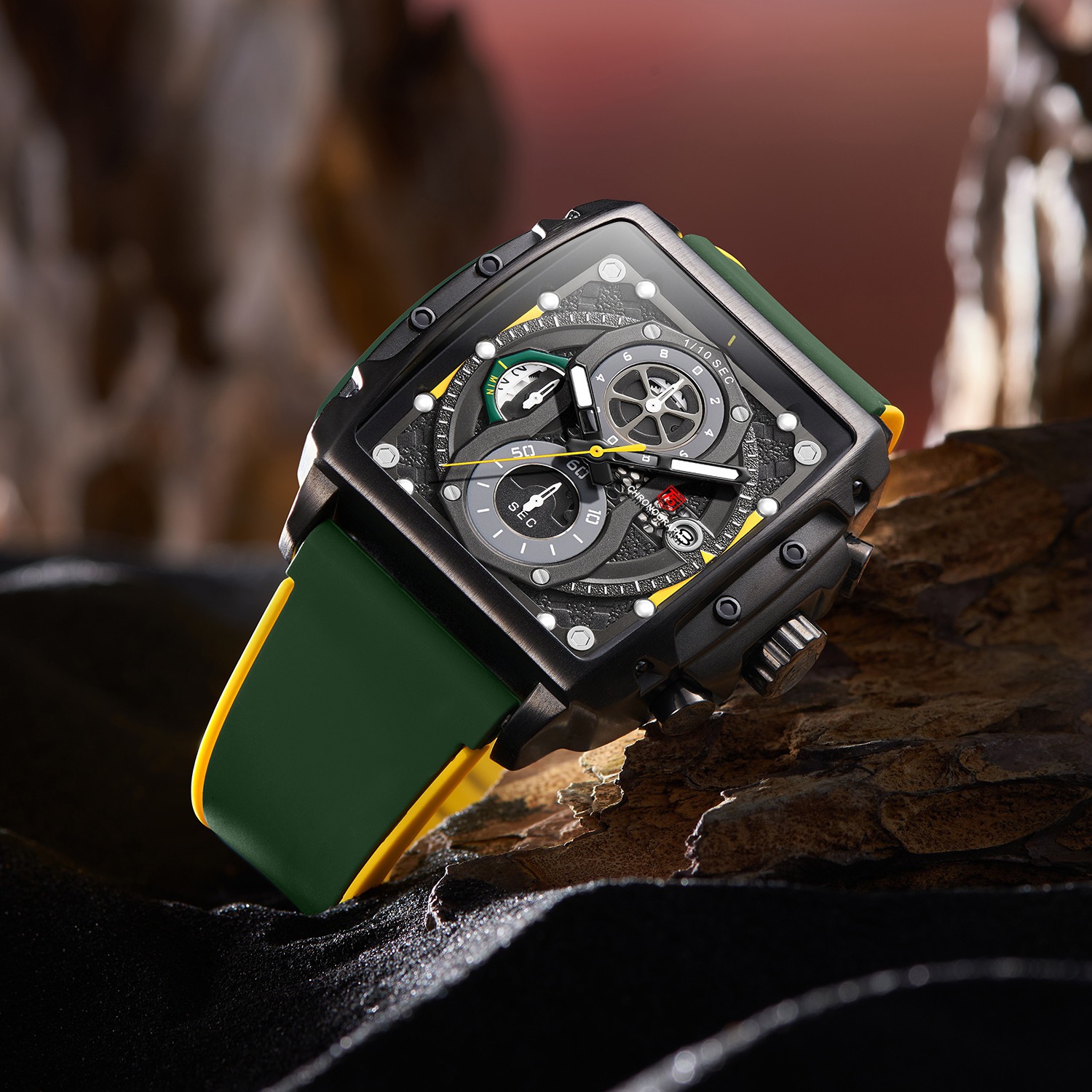 Featuring a 43mm rectangular alloy case and rubber strap, the T5 H3920G offers modern styling with quartz precision. Mineral glass and 30m water resistance add utility. A bold design that’s crafted for men who demand more from their accessories.