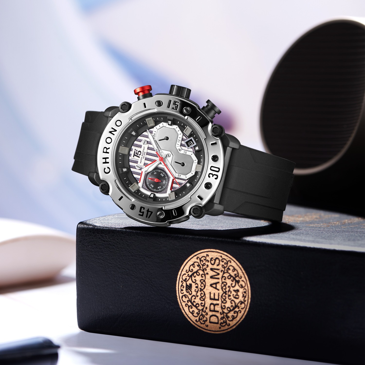 Designed with a 47mm round alloy case and rubber strap, the T5 H3983G combines style and functionality. Quartz movement and mineral glass ensure precision and protection. Let this bold timepiece redefine your everyday style.