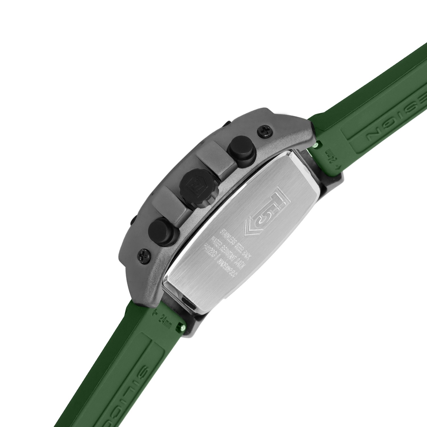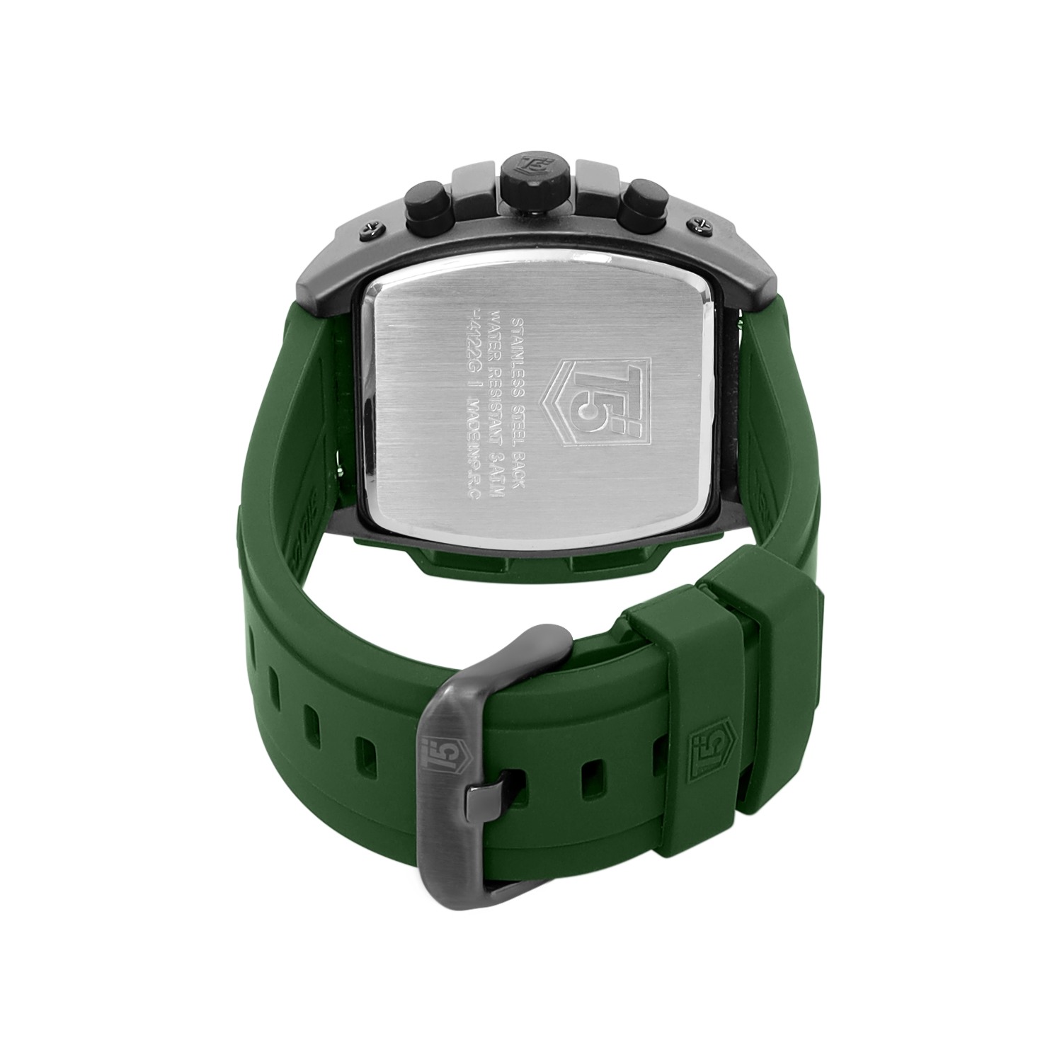 This tonneau chronograph features a 45mm alloy case, green dial, and green silicon strap. With quartz precision, mineral glass, and 30m water resistance, it’s a bold and functional accessory.