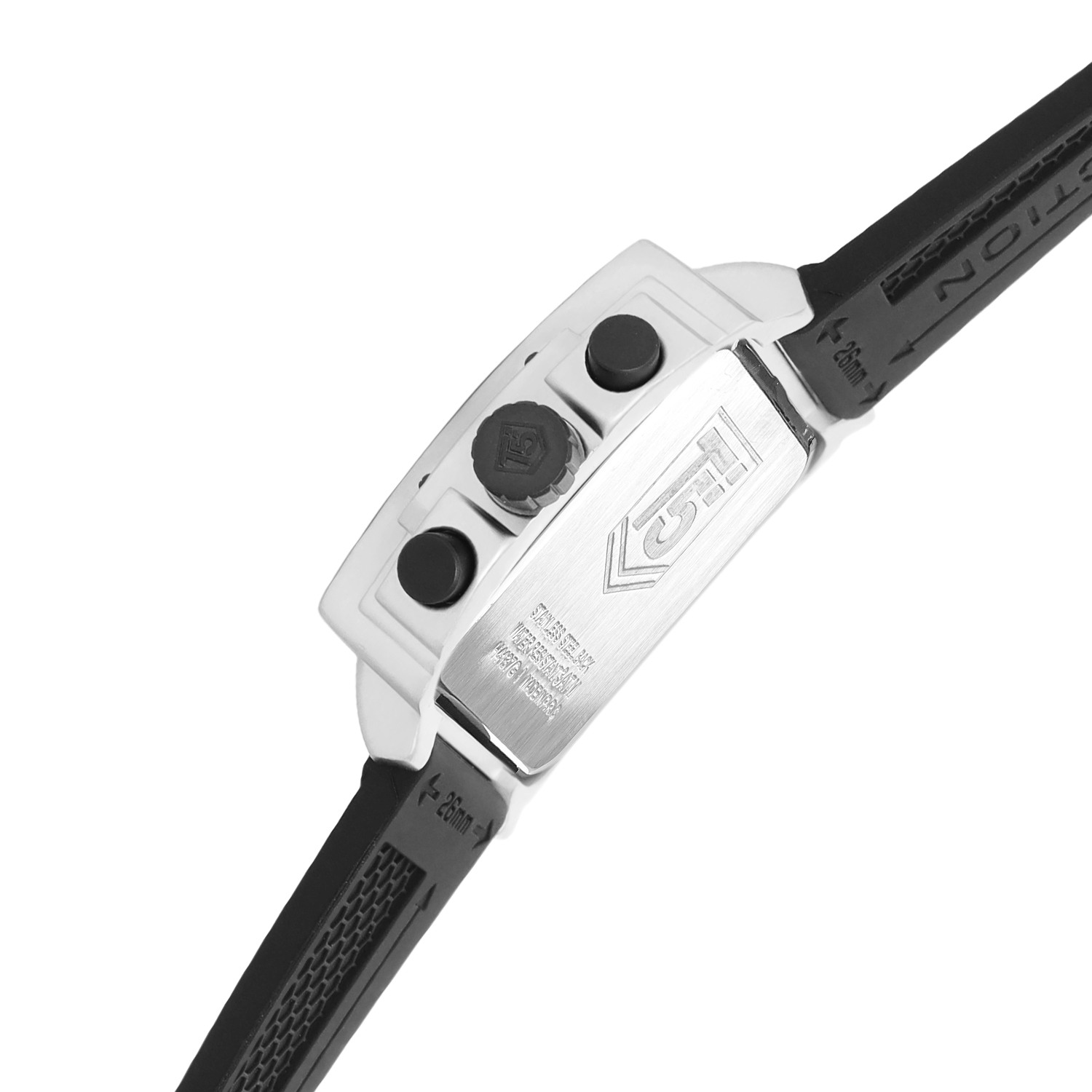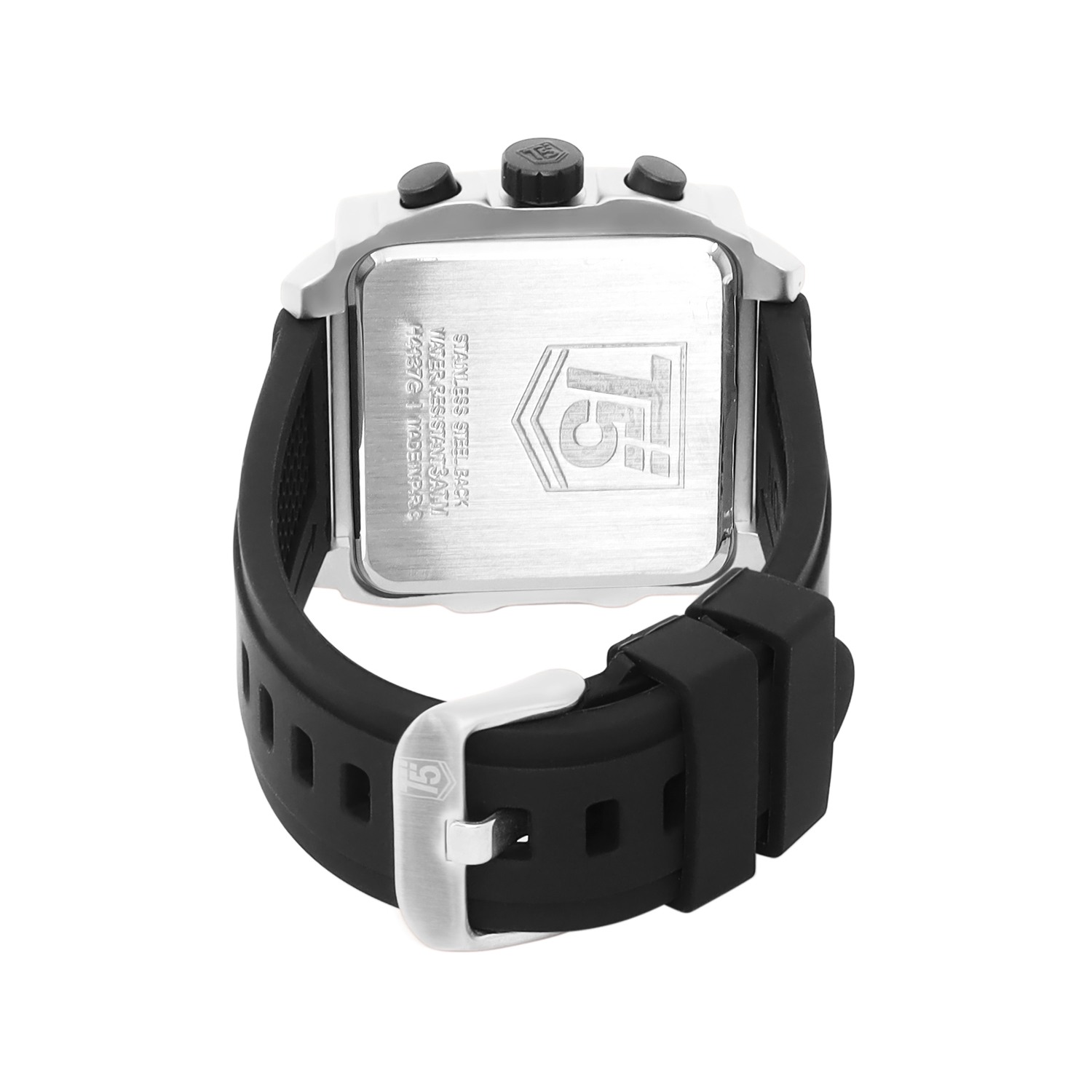 A square men's chronograph watch with a 45mm alloy case, black dial, and black silicon strap. Powered by quartz movement and featuring mineral glass and 30m water resistance, it’s a modern classic.
