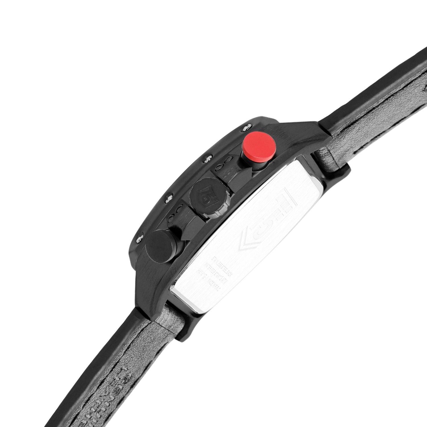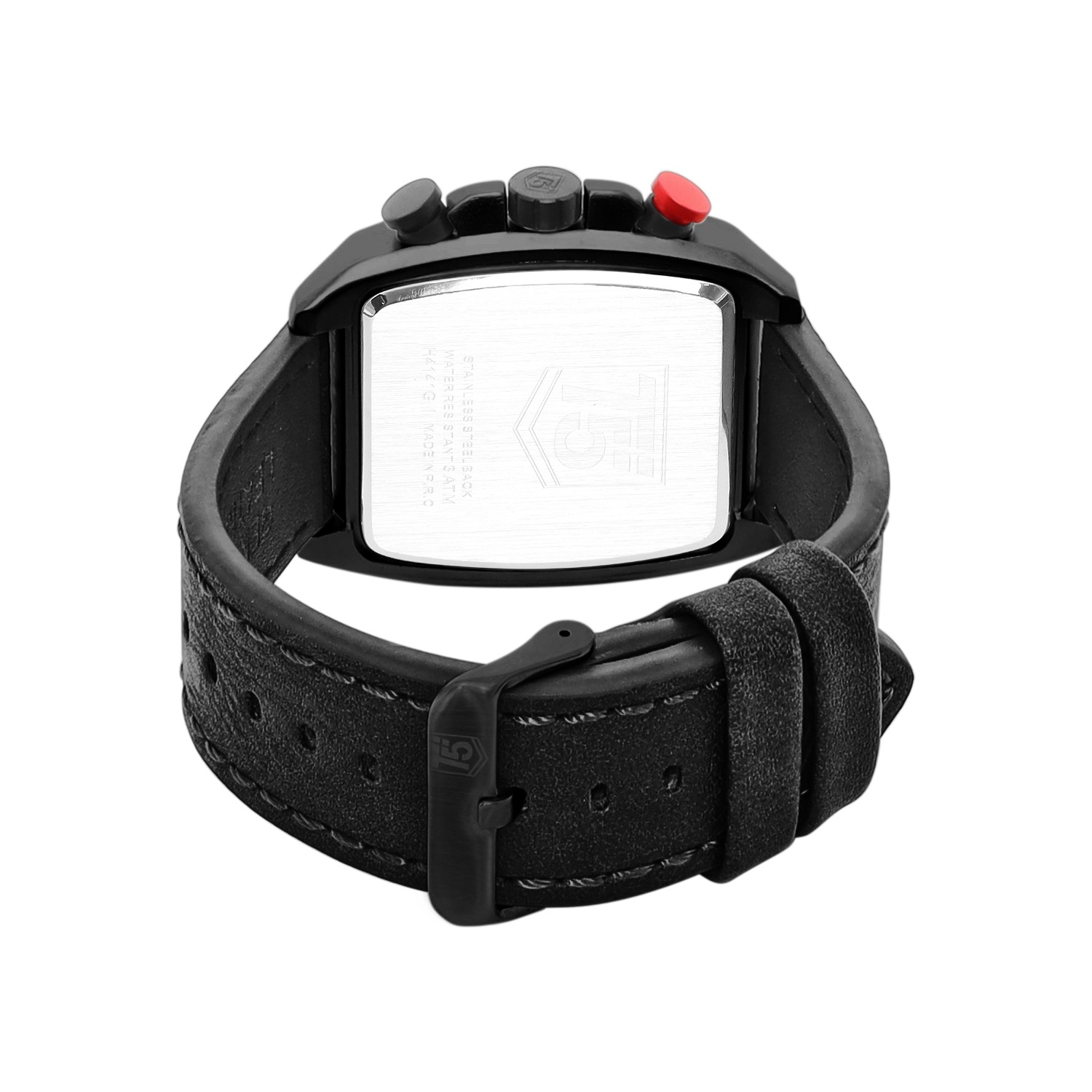 A tonneau-shaped men's watch with a 41mm alloy case, black dial, and black leather strap. The quartz chronograph, mineral glass, and 30m water resistance make it a sophisticated choice.