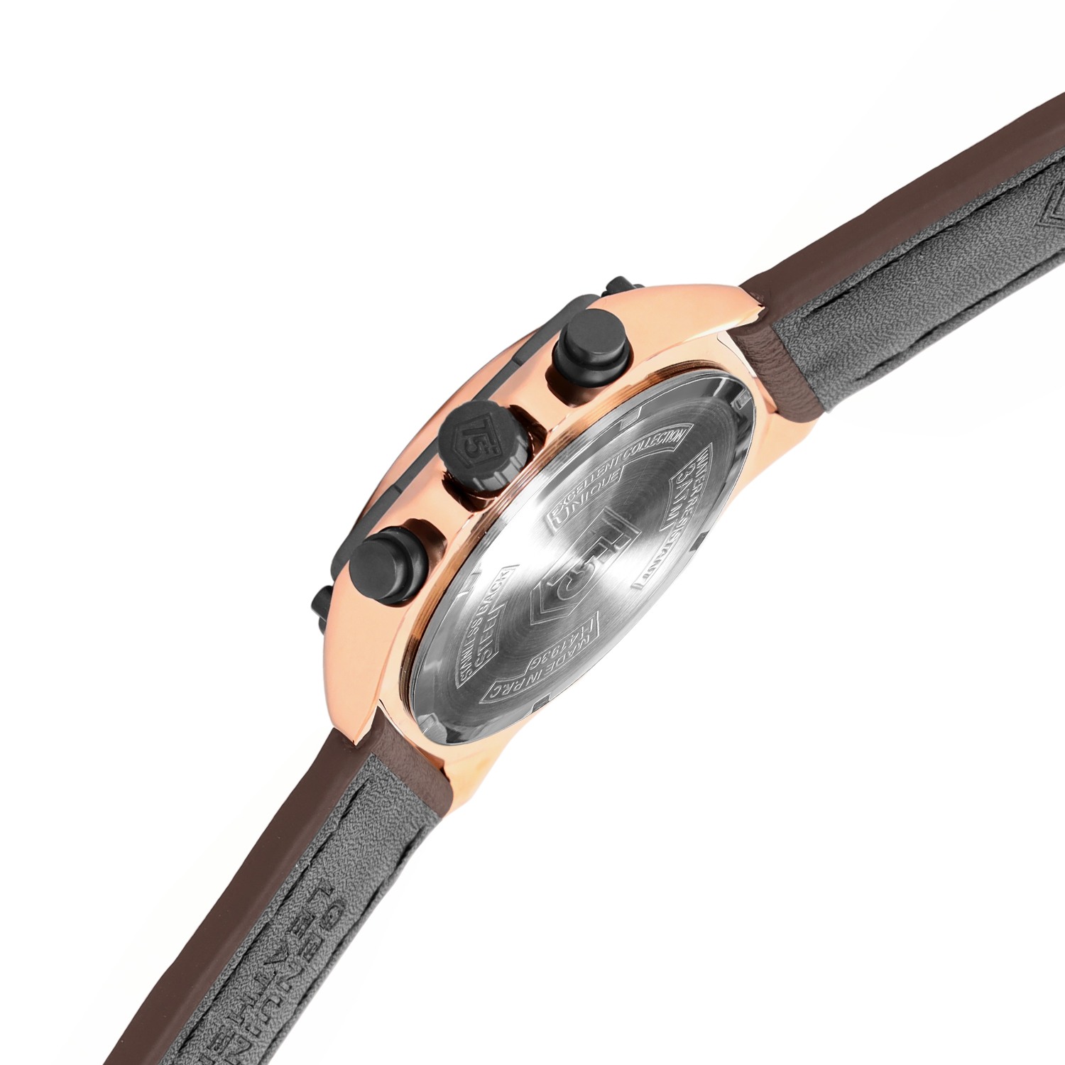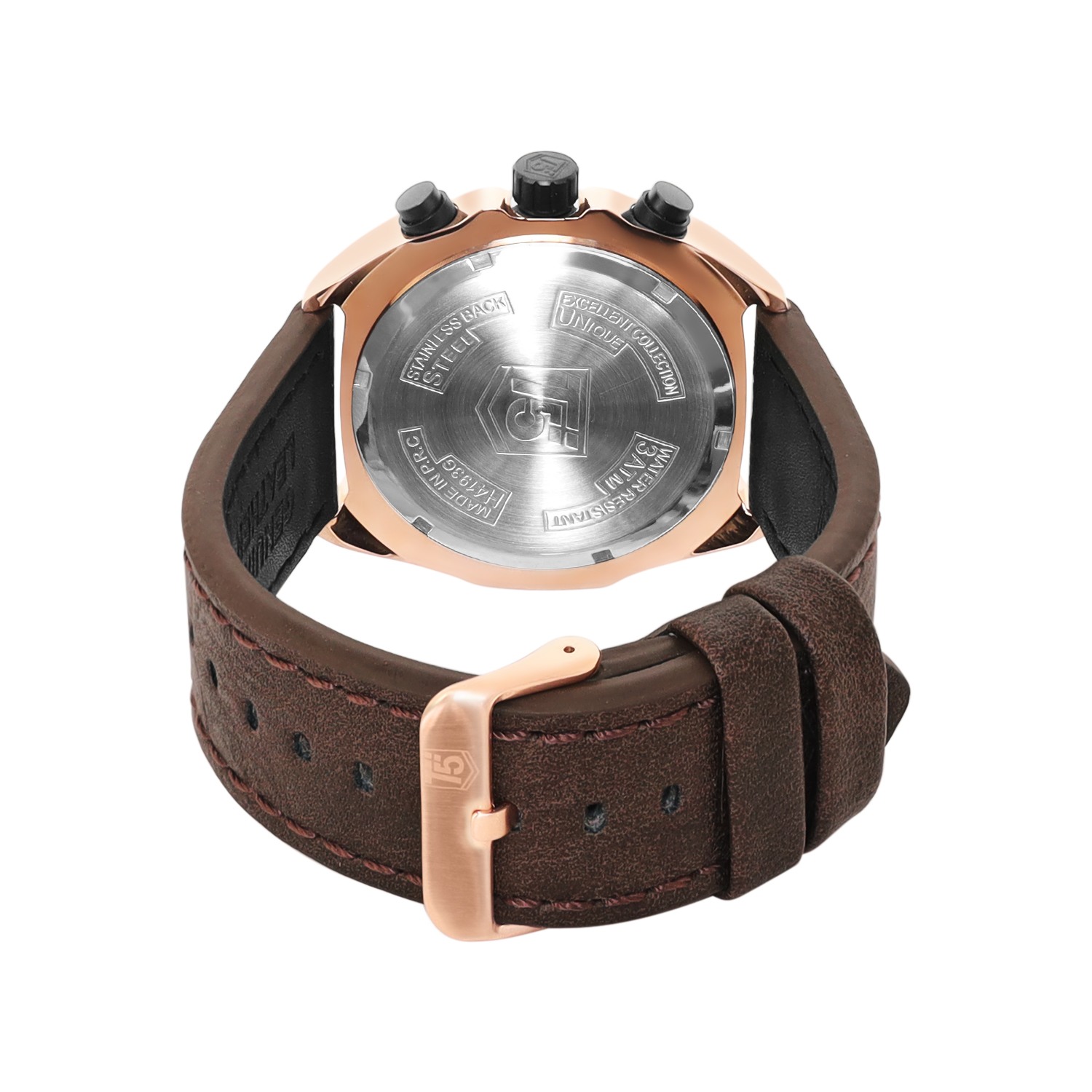 This round chronograph watch includes a 45mm alloy case, black dial, and brown leather strap. With quartz movement, mineral glass, and 30m water resistance, it’s a classic and practical accessory.