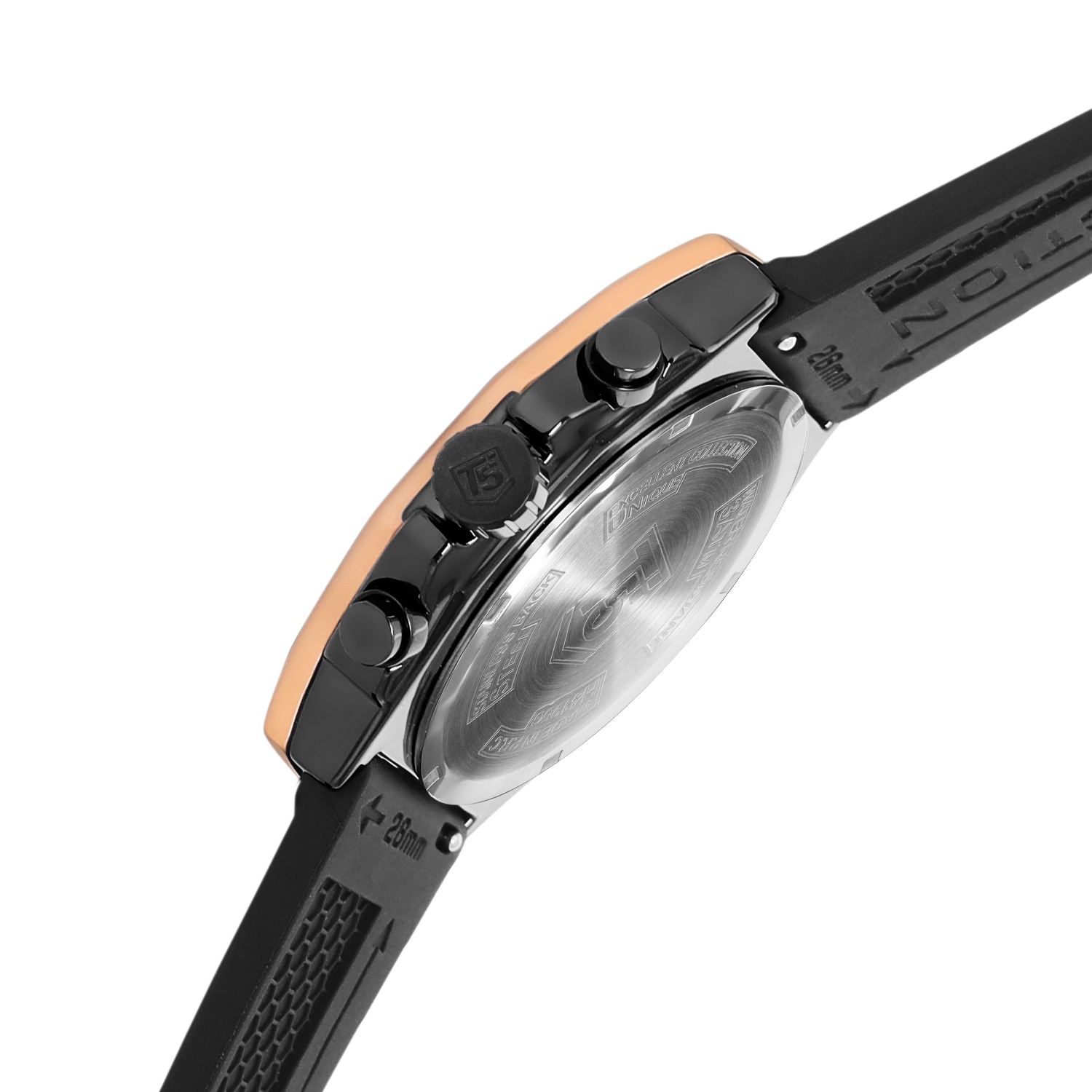This round chronograph features a 43mm alloy case, black dial, and black silicon strap. Powered by quartz movement and offering 30m water resistance, it’s a versatile and modern timepiece.